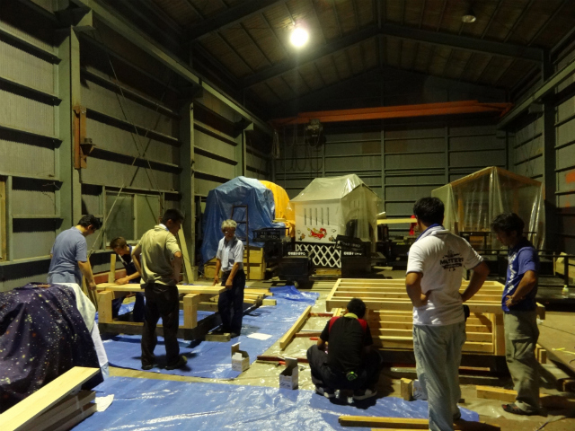 | 2012/07/18 太鼓山車の制作開始です。 太鼓山車の制作開始です。棟梁は、木下くん。 打吹童子ばやし副代表の日野さんを中心に制作開始です。 男衆は、夕方6時、仕事が終わってから集合。9時前まで頑張りました。 今年は、日野号・太鼓山車2台・田中号で祭りを盛り上げます。 |