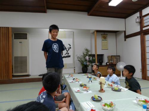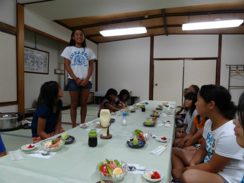 | 2012/07/21 合宿初日 みんな頑張りました。 みんなが最後まで頑張りました。 たくさんの差し入れありがとうございました。 末兼わかなさん(3年生)が、しの笛のレギュラー試験に合格しました。いよいよレギュラーですね。おめでとう。レギュラーの証をみんなの前から贈呈しました。 |