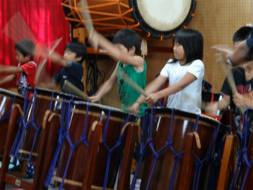 | 2012/07/18 定例練習会 基本打ち、リズム遊びをたくさんしました。 途中リズム遊びの中で、向山夢太鼓のリズムを打ってみました。気持ちがのって来ましたよ。 打吹で山車巡行で演奏する「日本のまつり」を短縮バージョンでやってみました。凄いです♪全員がぴたりと終りました。 6時 あらためて 練習開始のセレモニーをしました。 まずは、リーダーから今日の目標です。「気持ちを集中して、声を出していきましょう。」 副リーダー「強弱に気を付けること。テンポが速くならないように気を付けましょう。」 ワッショイコールをして練習開始です。 鼓魂(一番太鼓は、Aパートが吉良くん、Bパートが中山くん。)→打吹童子ばやし1章、2章 新・八犬伝の戦いの章、宴の章 MATSURI(ショート) 終わりのあいさつ リーダーから今日頑張ったこと「みんなが集中して練習ができたし、声も出ていて良かったです。」 副リーダーから「強弱を意識して演奏できていました。テンポは少し早くなってしまうところもあったけど、みんなが気を付けて演奏できていました。」 頑張っていた人を発表です。田中しょうた君から「末兼くんです。声をしっかり出して演奏していました。」(拍手) ワッショイコール♪をして練習を終わりました。 いよいよ、夏休みです。そして、21日、22日は合宿です。 休憩時間には、お互いを高め合う姿を期待していますよ。