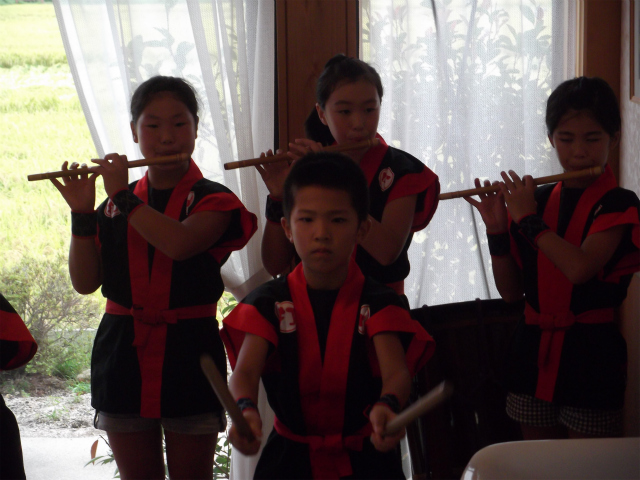 | 2011/10/01 打吹四人ばやしで敬老会にて演奏 関金インターケアハウス・関金みのりグループホーム合同敬老「収穫祭」に 打吹四人ばやしで「長谷寺の絵馬伝説」「MATSURI」を演奏しました。 篠笛にみゆちゃん(小4年生)、宮太鼓にあきらちゃん(小6年生)とかんなちゃん(小5年生)に協力していただきました。ありがとう。 わっしょいわっしょい♪と大盛り上がりでしたね。 エンディンッグはばっちり決まりましたね。終わり良ければ・・・良し良し♪ |