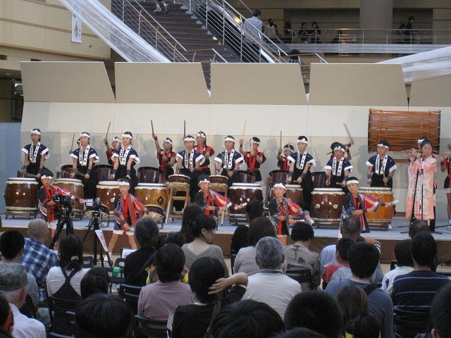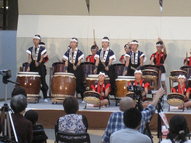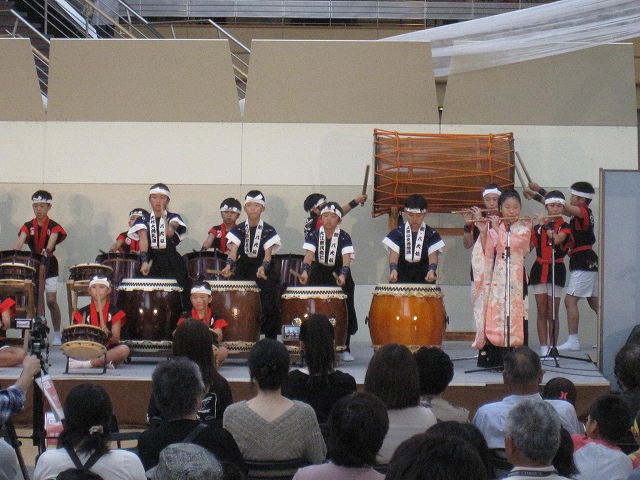 | 2011/10/15 .とりアート 「中部地区子ども芸能まつり」を盛り上げました。 鳥取県総合芸術文化祭 とりアート 「中部子ども芸能まつり」で演奏しました。 オープニングでは、「疾風」で開演を宣言。続いてオープニング演奏「MATSURI」でリトルバレリーナの皆さんとのコラボレーションをしました。 中部地区の伝統芸能や郷土芸能をがんばっている子ども達だけでなく、バレーや踊りなど、子ども達の芸能の発表会を企画しました。 @泊まり貝がら節保存会 A白鳳子ども太鼓 B三朝さいとりさし C社ソーラン(社小学校6年生) D向山夢太鼓(向山保育園年長組) E打吹童子ばやし 社小学校6年生の皆さんの「社ソーラン」は、6年生全員で参加してくださいました。気合十分に元気のいいソーランでした。 向山保育園の「向山夢太鼓」は、今年もすばらしい演奏に拍手が何度も起こりました。アンコールに応えて、もう一度演奏しました。アンコール演奏では、またすばらしい演奏に拍手が何度も起こりました。 本当にすばらしい演奏と保育園の子ども達の純粋パワーに圧倒されましたね。 いよいよ、打吹童子ばやしの出番です。 「MATSURI」と新・八犬伝より「宴の章」を演奏しました。 打吹童子ばやしの演奏には、たくさんの人から「このチームはどこの子ども達ですか。うまいねえ。」と賞賛の声をいただきました。 打吹童子ばやしの強みは、篠笛のメロディーがあるところだなあ思います。 さあ、国文祭に向けて、「演奏のノリと魅せる」をテーマに、集中力を高めて練習していきましょう。 演奏では、声を出すところをきちんと出せるように練習しましょう。 宴の踊りは、練習不足です。きちんと決めるところ、そろえるところを丁寧に練習しましょう。 |