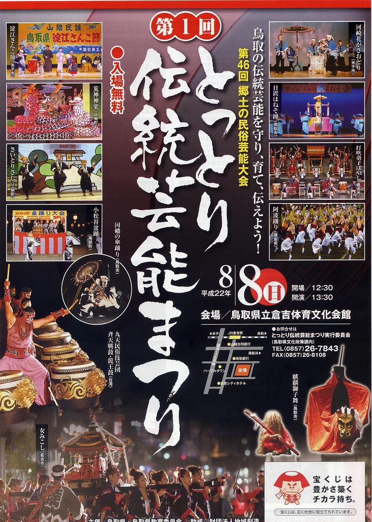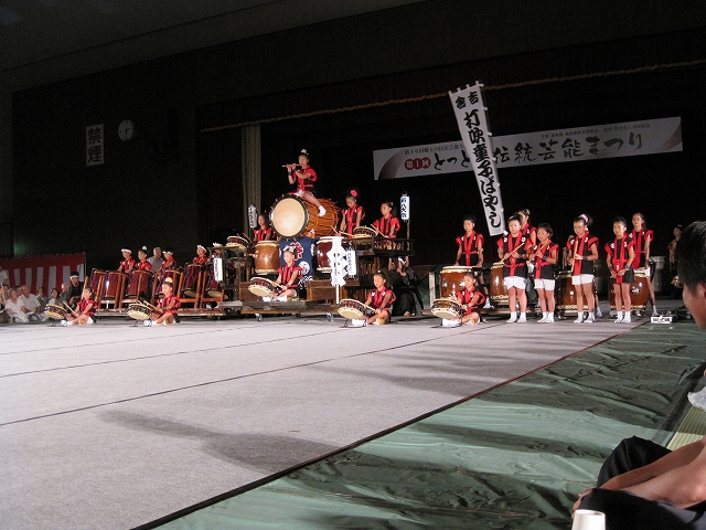 | 2010/8月8日(日)午後1時30分開演 打吹童子ばやしは女みこしとコラボします。 とっとり伝統芸能まつり ところ:倉吉体育文化会館 体育館 開演:午後1時30分 終演:4時 県内東中西の伝統芸能に、県外からは徳島県から阿波踊りごじゃへい、海外からは台湾から歴史ある太鼓連がきます。 天候の心配のない、暑さ関係ない体育館 つまりはアリーナで伝統芸能が共演します。 打吹童子ばやしは女みこしとコラボします。 お楽しみに!!!!!!!! |