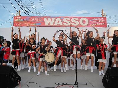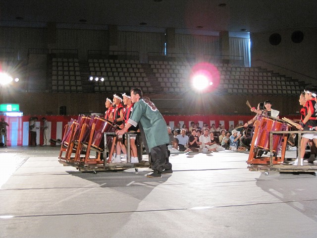 | 2010/07/31 倉吉スターロイヤルで交流演奏会 琴浦町の帰りに、倉吉スターロイヤルで交流演奏会をしました。 交流パーティーでの演奏はありますが、施設で交流演奏するのは初めてです。 午後4時開始で、MATSURI→打吹童子ばやし→宴 を演奏しました。これでだいたい30分のプログラムです。 演奏のあとは会場の一人一人のおじいさんおばあさんと握手をしてふれあいを深めました。 手拍子や拍手をいっぱい頂きました。中には最初から最後まで太鼓を打つ真似をするおばあさんもありました。 涙を流しながら手拍子をしてくださったおばあさん。最初から最後まで休みなく手拍子を下さったおじいさん。 みなさんに本当に良くしていただきました。 最後は片づけまで手伝ってくださいました。