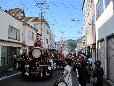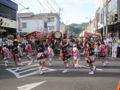 | 2010/08/07 打吹まつりでワッショイ♪ 4時30分 倉吉銀座通りの飛天ステージから阿波踊りごじゃへいのパフォーマンスが5分、その後 女みこし2基の先導で阿波踊りが進行していきました。 我々は、タカラヤ前から出発。牛鬼の出発地点のごうぎん駐車場まで、MATSURIの曲で進行しました。 打吹童子ばやしは祭りの盛り上がりを楽しみました。 |