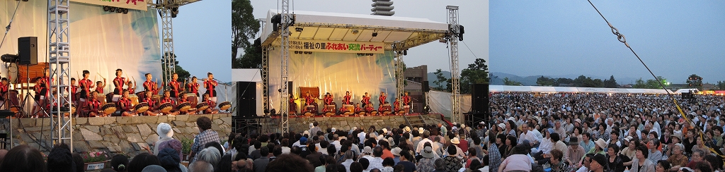 | 2010/07/10 福祉の里ふれあい交流パーティーで 2部の最後を飾って、大勢のお客様の前で演奏しました。 細川たかしさんの歌謡ショーの前とあって客席は超満員。打吹童子ばやしレギュラーメンバー22人が打吹童子ばやし「天女と童子の物語」をかっこよく演奏しました。3章祭囃子では手拍子をいただきました。うれしかったね。 夕方5時15分 打吹童子ばやしのMATSURIの演奏で開演しました。25人のメンバーが演奏しました。素晴らしいステージとたくさんのお客様の前で演奏ができました。ありがたかったですね。 演奏終了後 竹内克文さんと小谷貴代子さんと一緒に記念撮影しました。 |