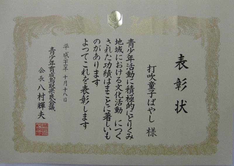| 2009/10/18 青少年育成県民会議で表彰されました。 10月18日(日) 打吹童子ばやしのこれまでの活動が評価され、青少年育成県民会議で表彰されました。 倉吉市から推薦され、県表彰を受けました。 |