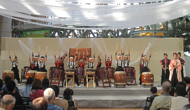 | 2009/11/08 鳥取県総合芸術文化祭 鳥取県総合芸術文化祭中部地区事業が倉吉未来中心アトリウムで11月7日(土)、8日(日)の2日にわたって開催されました。 11月8日(日)10時開演で中部地区の「青少年伝統芸能のつどい」を開催しました。 中部の伝統芸能活動に頑張っている青少年が集まって練習の成果を発表しました。 @<湯梨浜町>東郷小学校飛龍隊(龍踊り) A<倉吉市>倉吉総合産業高校吟詠剣詩舞部(吟詠剣詩舞) B<湯梨浜町>泊貝がら節保存会(泊貝殻節) C<三朝町>三朝南小学校(さいとりさし) D<北栄町>瀬戸獅子舞保存会(伯耆神楽瀬戸獅子舞) E<倉吉市>打吹童子ばやし(新・八犬伝) 打吹童子ばやしは里見伝説「新・八犬伝」を演奏しました。 日本のまつりのステージを見たという方が追っかけで来場くださいました。 みなさんが、「また上手になったんじゃない。」 口々に誉めてくださいました。 中には、初めて見たという方もおられました。 太鼓を演奏した子ども達は、小学2年生から5年生のメンバーです。 応援に駆けつけてくださった皆さんありがとうございました。子ども達にとって励みになります。 次は、来年3月13日(土) 倉吉未来中心小ホールで開催する「子ども太鼓のつどい」に向けて頑張ります。 10月末から、いろんな小学校でインフルエンザが流行っていて、練習日になかなか全員集合ができなかったけど、子ども達は頑張りました。 次の練習日からは、お家芸の「打吹童子ばやし 天女と童子の物語 」を練習していきます。 新人さん達は、日本のまつりであまり太鼓の練習ができていないので、次回からは、3月に向けて気合を入れて頑張りましょう。 |