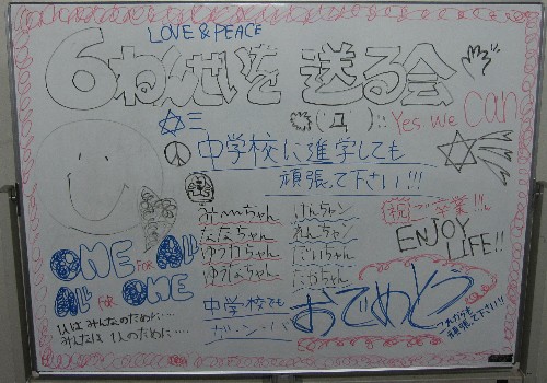 | 2009/04/04 6年生を送る会をしました。 卒業おめでとう。 4月4日夕方6時から、6年生を送る会をしました。 長い人で6年間。小学1年から頑張りました。8人の子ども達が卒業です。 打吹童子ばやしの「新・八犬伝」を2006年に発表以来みんなをリードしてきた子ども達です。 これからは中学生として打吹童子ばやしに参加してくれると思います。勉強や部活で忙しくなるけど、10月に行われる日本のまつりIN鳥取では、感動の演奏舞台を目指しますよ。よろしくね。 卒業生にはみんなから記念品を贈呈しました。 20年度最後まで頑張ってくれた中学生組にはピンクの紐の桶胴ミニを贈呈しました。 保護者のみなさんもお疲れ様でした。 21年度保護者会会長は田中さんが続投です。 |