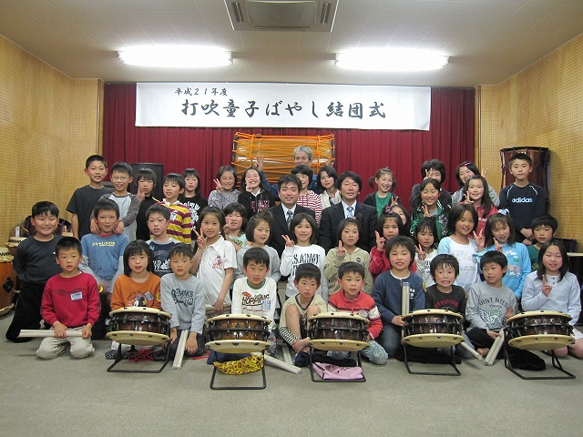 | 2009/04/15 平成21年度打吹童子ばやし結団式をしました。第18期の活動がスタートです。 倉吉市勤労青少年ホームで午後6時より 平成21年度打吹童子ばやし(第18期)結団式をしました。 新団員10名を迎えて総勢55名でスタートです。 小学1年生〜6年生までは43名です。 打吹童子ばやし振興協議会の副会長で社団法人倉吉青年会議所の理事長小山裕二さんにお祝いの言葉をいただきました。新団員紹介の後、真新しいバチをプレゼントされました。 デモ演奏は長谷寺組による「長谷寺の絵馬伝説」 新団員の当面の目標曲です。 結団式の後、早速第1回の練習をしてみました。ことしはレベルが高いよ。先輩達もうかうかしてられないよ。まずは、太鼓道10級からですね。 |