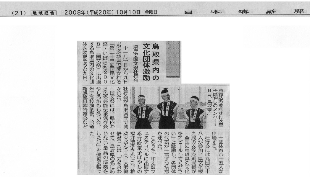 | 2008/10/09 国文祭参加団体壮行会に出席しました。 11月9日午後4時より 県庁で「国民文化祭いばらき」参加団体壮行会が行われ、 打吹童子ばやし団員リーダー福井さん、副リーダー柏さん、大濱君の3人が出席しました。 鳥取県文化観光局長さんから激励の言葉を頂き、各団体代表者が参加出演にあたっての決意表明をしました。 打吹童子ばやしは、3人が短いながらもしっかりとした決意を述べました。 |