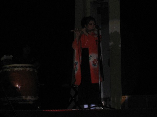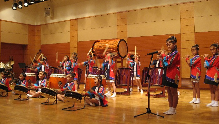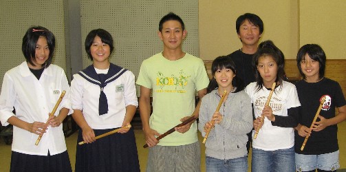 | 2008/09/15 湯梨浜町田後公民館敬老会で心を込めて演奏しました。 9月15日(敬老の日)正午より 「新・八犬伝」を国文祭メンバーで演奏しました。 (実際には、中学生組が3人欠でしたが 義と礼はミニ八犬士が代役でがんばりました。) 昨日は、長谷寺組が頑張ったので、今日は特別気持ちが入った演奏でした。 おじいちゃんおばあちゃんのお祝いの席で心を込めて演奏しました。 「新・八犬伝〜宴の章」では、特別に子ども達の踊りも入って、会場が和みました。 涙して拍手をいただきました。おばあちゃんから御祝儀もいただきました。 アンコールは「打吹童子ばやし〜天女と童子の物語」より3章「祭ばやし」を演奏しました。 とっても喜んでいただいたので、おまけで打吹童子ばやし「プロローグ・1章」も演奏しました。 心からおじいちゃんおばあちゃんの長寿をお祝いしました。 最後まであたたかい声援と拍手をいただきました。 2ヶ月後には国文祭です。県代表ということを自覚して、さらに向上心をもってレベルアップしようね。 本日演奏機会をくださった田後公民館のみなさんありがとうございました。