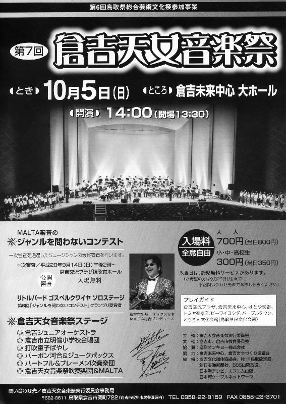 | 2008/10/02 MALTA総合プロデュース 倉吉天女音楽祭 10月5日 午後2時開演 倉吉天女音楽祭 倉吉未来中心大ホール 10月5日(日)午後2時開演 午後2時3分 打吹童子長谷寺組 コンテスト1番目に登場 午後2時54分 打吹童子ばやし「新・八犬伝」演奏 長谷寺組が踊りを踊ります。向山保育園の子ども達が踊りで合流参加です。 「新・八犬伝」では、 踊り隊45人、演奏者21人 総勢66人で 舞台を盛り上げます。 お楽しみに! |