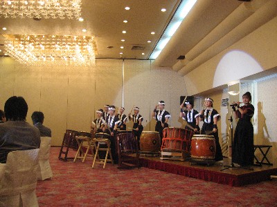 | 2007/02/17 結婚式を盛り上げました。 いつもお世話になっている小前さん岩木さんの結婚披露宴で、 打吹童子ばやしの子ども達 八犬士組による「新・八犬伝→宴 UTAGE」結婚式バージョンの演奏でお祝いしました。 倉吉シティホテル 4時から結婚式(人前式)に参列。 4時20分から、幸せなお二人の前で、 お二人と臨席の皆さんの未来に幸多かれと思いを込めて演奏しました。 お母さんたちも太鼓の撤収スタッフとして会場入りし、一緒にお祝いしました。 |