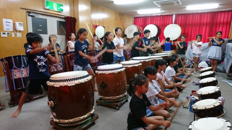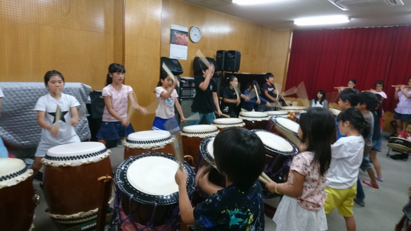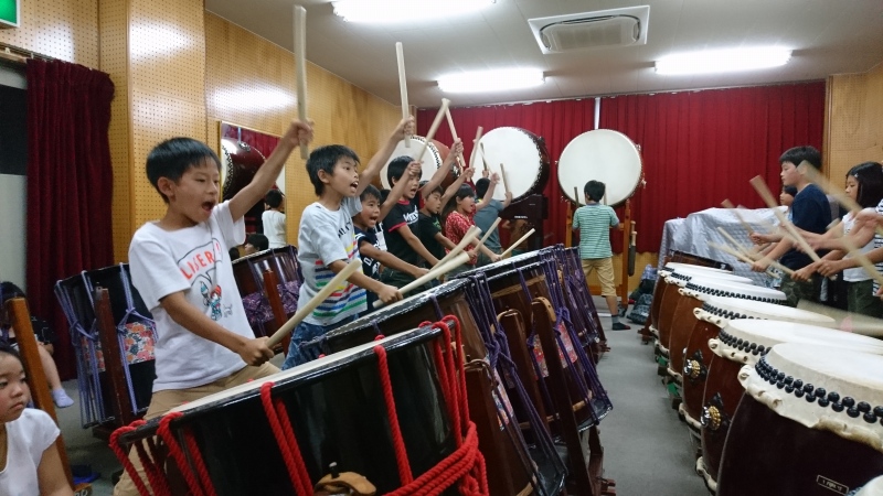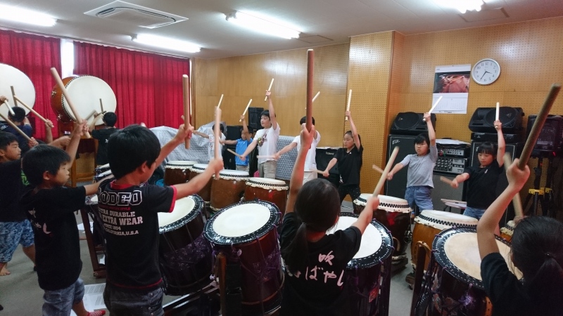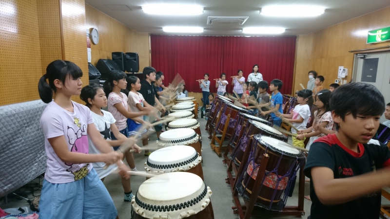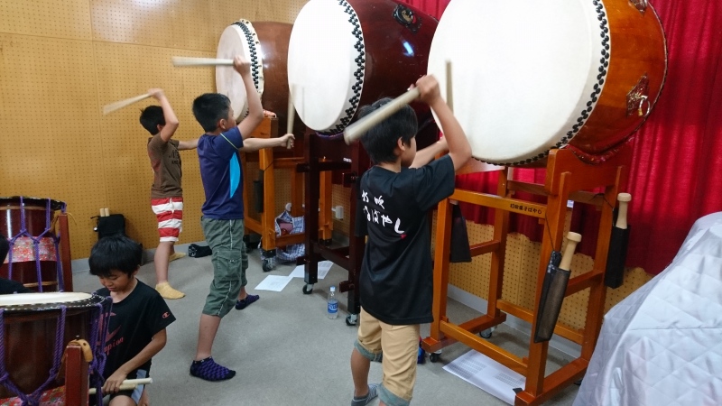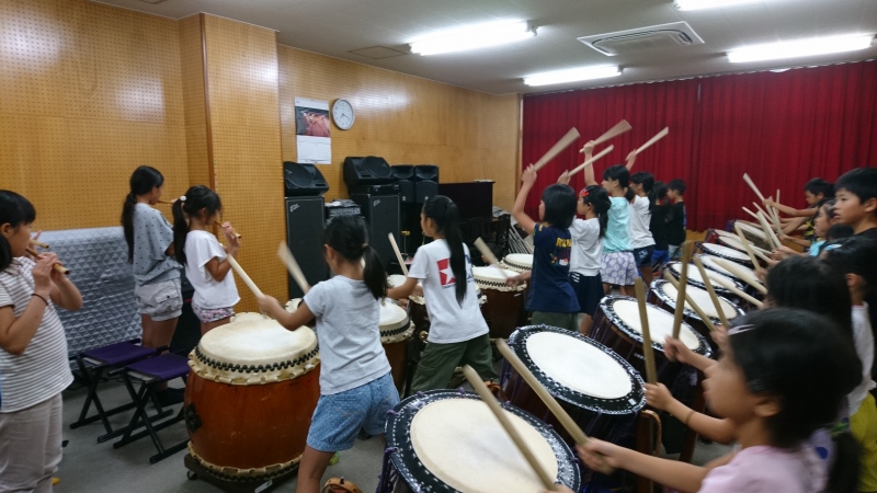 | 2017/07/5 定例練習会 基本打ちを目的にリズム遊びを1時間かけてたっぷりしました。いつものパートだけではなく、締め太鼓、長胴太鼓、桶胴太鼓、色んな太鼓を打ってみました。 2年目以上のメンバーで「打吹童子ばやし」を気持ちを入れて演奏しました。最後に全員で「MATSURI」を演奏して練習を終わりました。 |