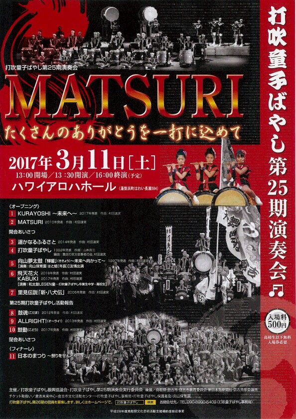 | 2017/02/02 打吹童子ばやし第25期演奏会はアロハホールで開催します 願いは叶いませんでした・・・(T T)。 心機一転!! 打吹童子ばやし第25期演奏会は、「子ども達の晴れ舞台をつくろう!!」 会場を倉吉未来中心大ホールから湯梨浜町のハワイアロハホールに変更して、3月11日(土)に開催します。 チラシ、ポスター、協賛広告、チケット販売等 いよいよ動き出しますよ!! たくさんの方に支えられて25年☆震災からの復興を願い作曲した新曲「KURAYOSHI」を発表します。たくさんの方に聴いていただきたいです。客席数が490と若干少ないですが、みなさんどうぞご来場をお待ちしています。 |