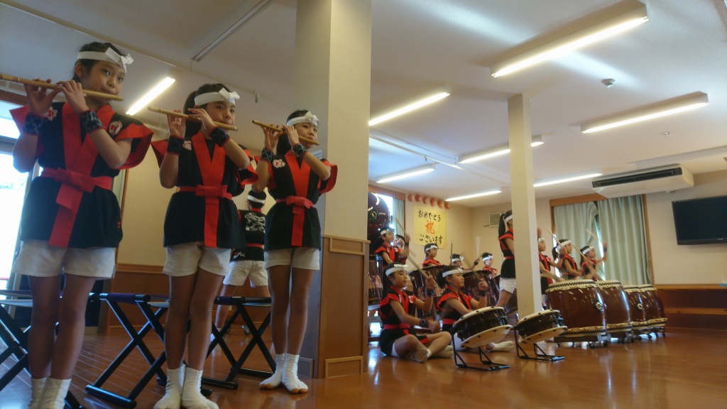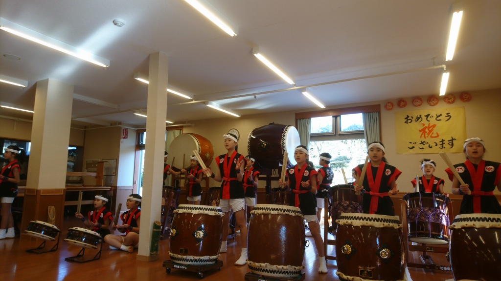 | 2017/02/04 べるびゅー大栄さんで慰問演奏会をしました。 今日は、北栄町六尾にある高齢者施設「べるびゅー大栄」さんで演奏させていただきました。初めての訪問です。声をかけていただきありがとうございました。 「遥かなるふるさと」「打吹童子ばやし」・・・アンコールで「MATSURI」、メンバー紹介をさせていただいて、最後に「日本のまつり」を演奏しました。 6年生2人、5年生4人、4年生5人、3年生5人、2年生1人 17人でなかなか切れ味のある元気のよい演奏をしました。演奏後は、みなさんと握手をして終わりました。「日本のまつり」では心地よい手拍子をいただきました。 |