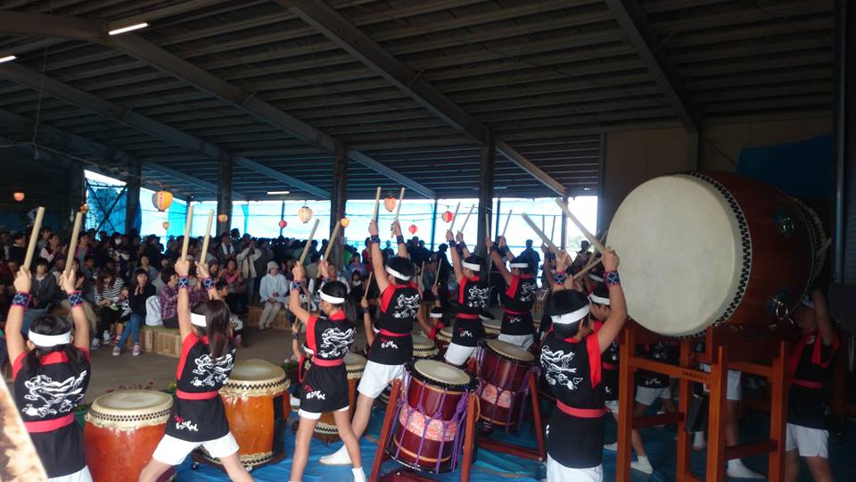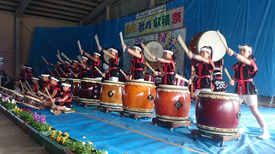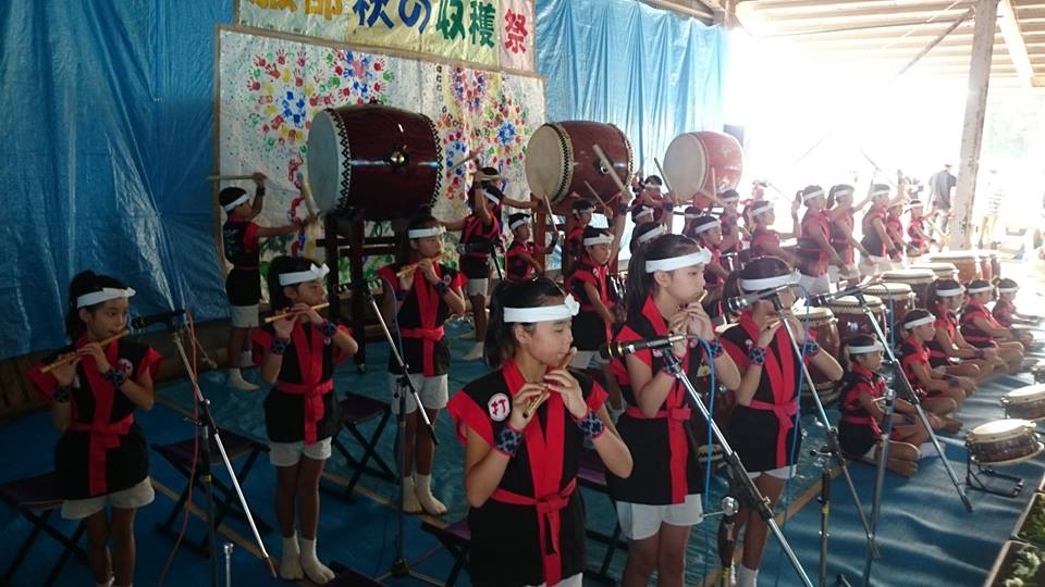 | 2016/10/16 第20回服部 秋の収穫祭 「第20回 服部 秋の収穫祭」に初出演しました。2016年10月16日(日) 9時40分ごろからの演奏予定は、すでにたくさんの人で9時30分から始まりました。「遥かなるふるさと」→「打吹童子ばやし1章・2章」→「MATSURIロングバージョン」を演奏しました。一回退場したのですが、アンコールをいただいて再登場。「MATSURIショート」を演奏させていただいて、最後に「日本のまつり」を手拍子をいただいて2循環演奏して終わりました。宮太鼓デビュー5人☆やぐら初6人打ち☆またまた今後が楽しみな子ども達です。 この祭りは、産廃問題で、農地を守るために始まったのだそうです。それから20年。今年は、昨年よりさらに凄い人で賑わって、用意されていた食材は、打吹童子ばやしの演奏が終了して、10時30分には、ほぼ完売してしまいました。名物の大根4本で100円☆畑でお気に入りを抜いておいで〜!!も、8時20分時点ですでに凄い行列でした。駐車場も満杯状態!まつりのあり方を考えさせられました。11時前には盛況にて終わってしまう祭り☆凄すぎる!! |