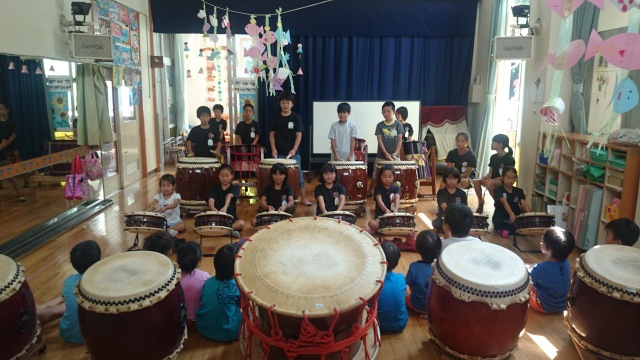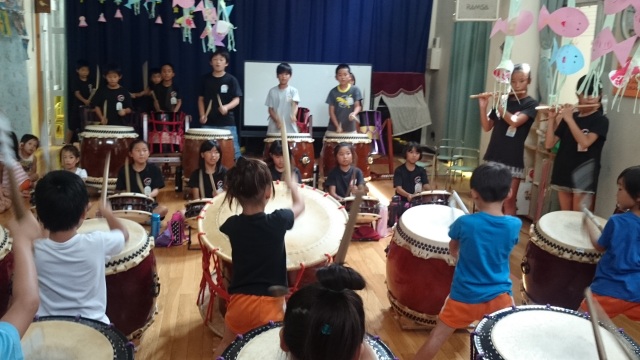 | 2016/08/04 向山保育園園児と太鼓で交流会 今日は、向山保育園からの要望を受けて、童子ばやしのレギュラー有志が交流会に参加しています。 保育園でしてほしいこと、してはいけないことを園長先生からお話を聞いて、早速、和太鼓で交流をしました。 8月6日の打吹まつりでする「日本のまつり」を年長組さん、年中組さんと一緒にしました。 交流会のあとは給食をクラスでいただきました。カレー味の麻婆茄子美味しかったあ(^^) 昼寝のトントンをお手伝いしたり、宿題したり、おやつをいただいたり、ゆっくり過ごしています。 |