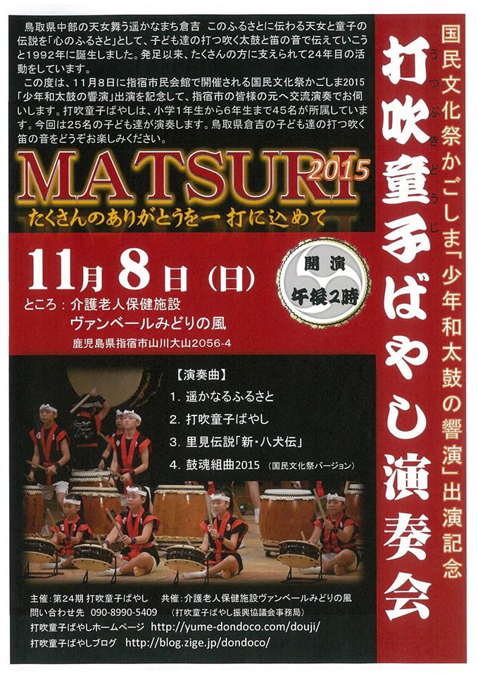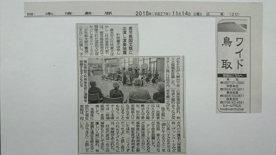 | 2015/11/08 国文祭の地で施設慰問 国民文化祭かごしま「少年和太鼓の響演」の本番を終えて、地元の人との交流を求めて施設慰問に行きました。老健)ヴァンベールみどりの風」さんへ伺いました。 1時間のプログラムで交流演奏会をしました。 指宿は、人も温泉もとっても温かかったなあ。子ども達は、たくさんの優しさに触れて、さらに成長できました。貝殻節も気持ちよく歌ったなあ。 |