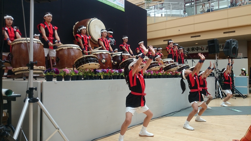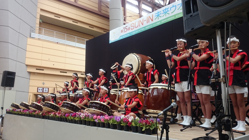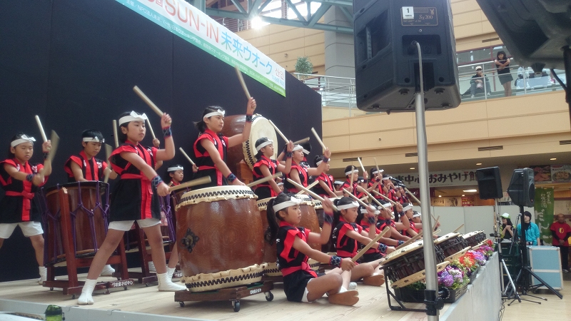 | 2015/06/06 SAN−IN未来ウオークを盛り上げました。 6月6日(土)SAN-IN未来ウオークの10時からの開会式で「MATSURI」を演奏しました。 続いて12時10分から、5キロ、10キロコースが帰ってこられるのに合わせての演奏です。 「打吹童子ばやし」(15分)と「鼓魂組曲」(12分)を演奏しましました。24期チームとして初めての舞台。なかなか良い演奏をしましたよ。 これから、練習と舞台を重ねるたびにたくましさが増していくことでしょう。6年生の役割(リーダー、副リーダー、部長)も少しずつかっこになってきました。まだまだ初々しいチームですが、これからが楽しみです。 |