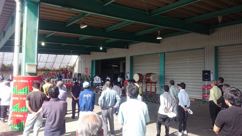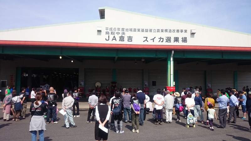 | 2015/06/07 倉吉スイカ出荷式 スイカの名前は「祭ばやし」☆ 6月7日(日)倉吉スイカ出荷式(JA倉吉スイカ選果場)で9時10分から演奏させていただきました。 演奏曲は「鼓魂組曲」(12分) 演奏曲の中には「祭ばやし」もあったのですが、なんと今回出荷される倉吉西瓜の名前は「祭ばやし」でした。晴天の中、倉吉スイカを満載にしたトラックが出発していきました。 お土産にスイカをいただきました。初物です。どっちむいて食べたら良かったっけ? 出荷式は、毎年出荷の日が決まるのが一週間前ということで、出演依頼をいただいたのも今週の火曜日の昼でしたが、保護者の皆さん子ども達に快く協力をしていただき、また「打吹童子ばやし」を知っていただくことができました。「上手だなあ。」「ほんとに小学生かえ。」「よかったよぉ。また来年もぜひ頼みますね。」などたくさん声をかけていただきました。土日でしたら、どこへでも行きますよ〜。 |