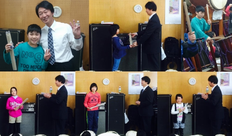 | 2015/02/11 新レギュラーが5人増えました 先週水曜日の定例練習会でレギュラーになった4人のメンバーにレギュラーの印とレギュラーバチを贈呈しました。 今日、5年生のとしやくんがレギュラーテスト(桶胴太鼓合格は90点以上)に合格しました。大分緊張しただろうなぁ・・・90点・・ぎりぎり通過です。よかったね!おめでとう。 新レギュラーのみなさん、おめでとう。レギュラーの印は重いですよ。早く、気持ちも技もかっこいいレギュラーになってくださいね。ここからが、いよいよ打吹童子ばやしメンバーとしての始まりですよ。努力は裏切らない!自分のことができたら友達のことも気にかけてあげれる大きな心の人になってくださいね。 |
