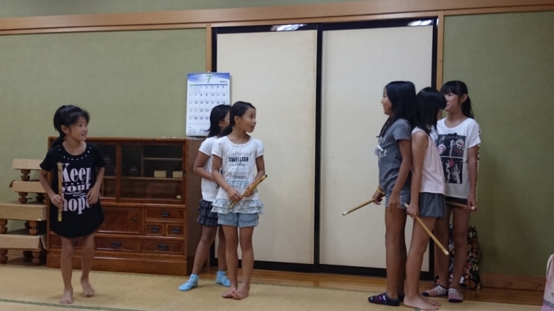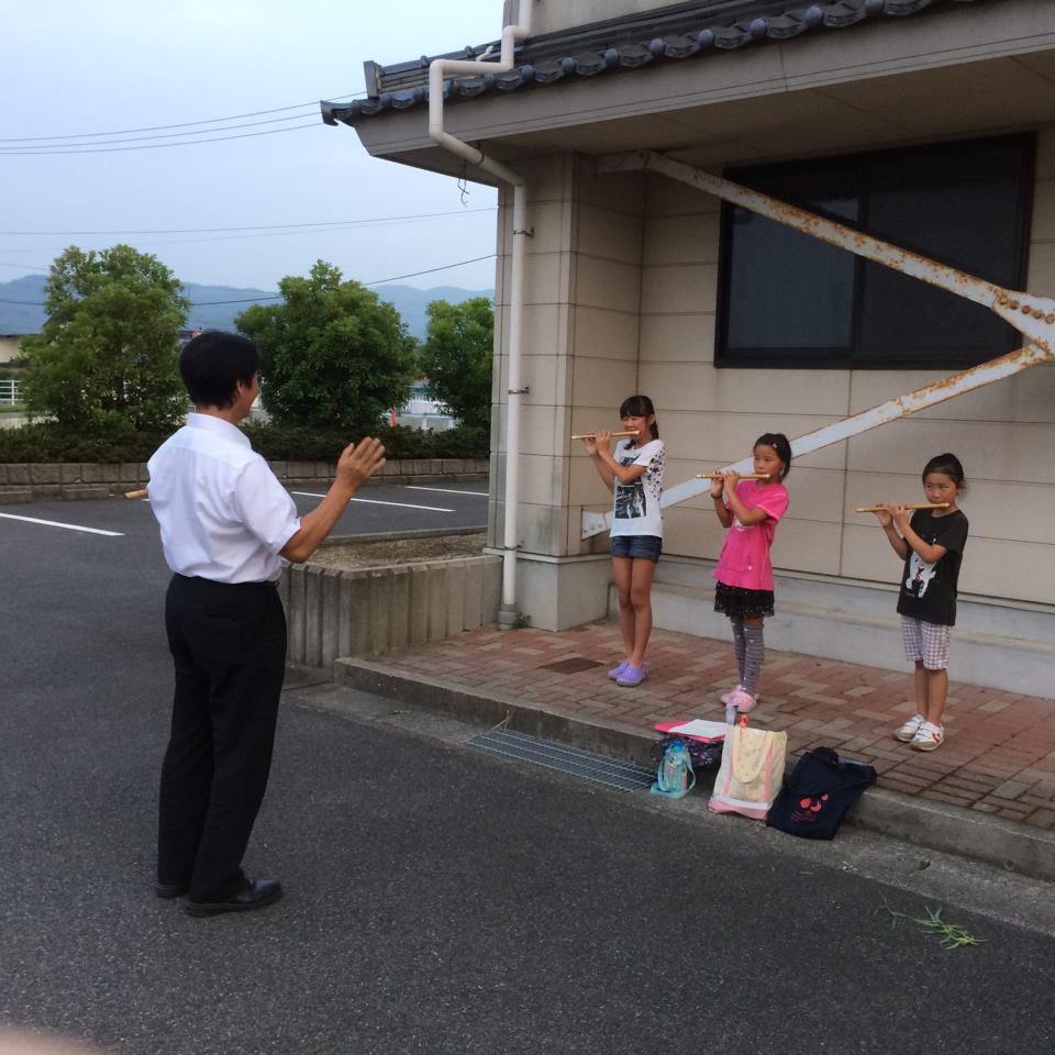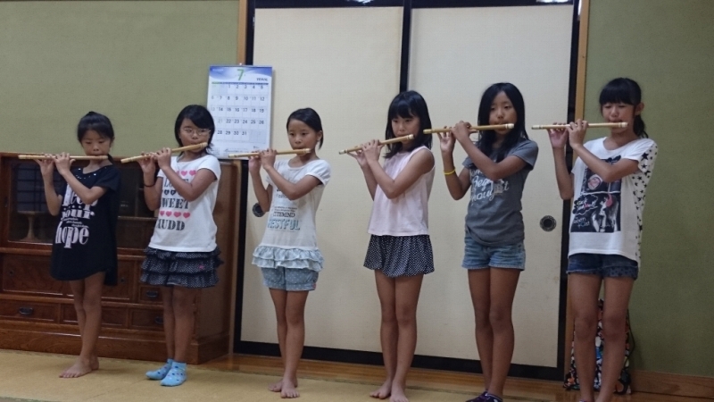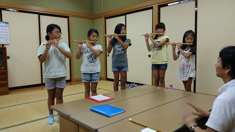 | 2014/07/15 しの笛隊練習会 2014年7月15日 夕方から しの笛隊練習会 今日は、ばえん祭の曲を少し練習してみました。みんなにCDと楽譜を渡しました。 レギュラー試験挑戦のために一人ひとり「打吹童子ばやし」を全章通して吹きました。他の子は、太鼓のパートを締め太鼓、桶胴太鼓、宮太鼓、やぐらに分かれて叩きました。 5年生、4年生メンバー5人が、部屋の対角線に立って、全員で「打吹童子ばやし」を全章通して吹きました。綺麗な音が響いていました。ピッチもしっかり合わせれていました。心地良い音です。 最後に、「日本のまつり」を通して練習を終わりました。 並びは背の順だそうです。背くらべしてました。 大きくなってました。 |