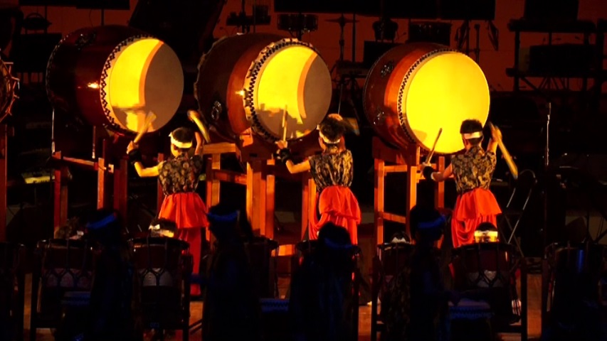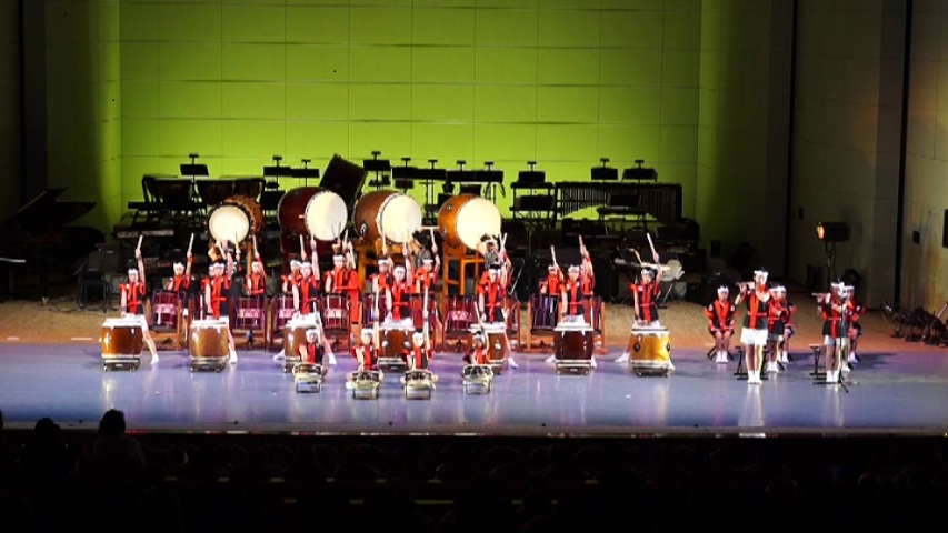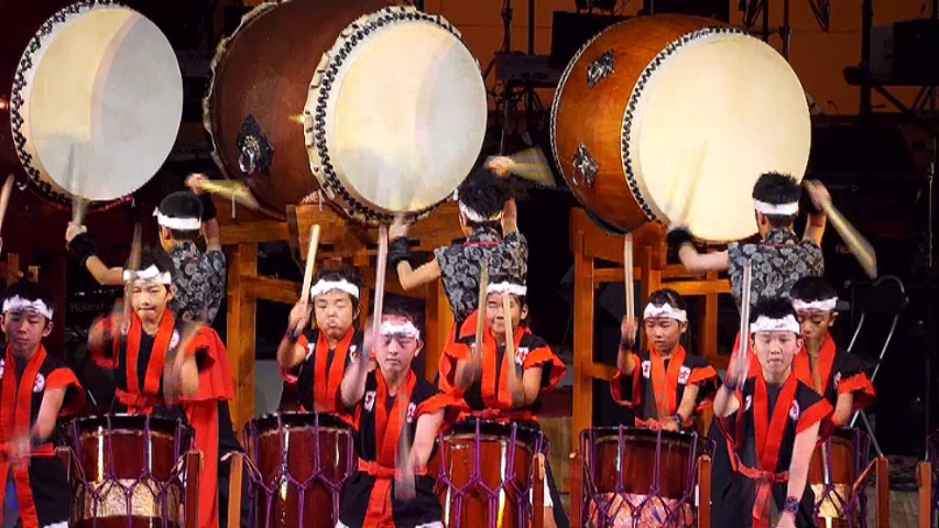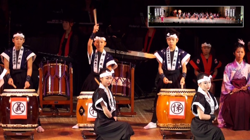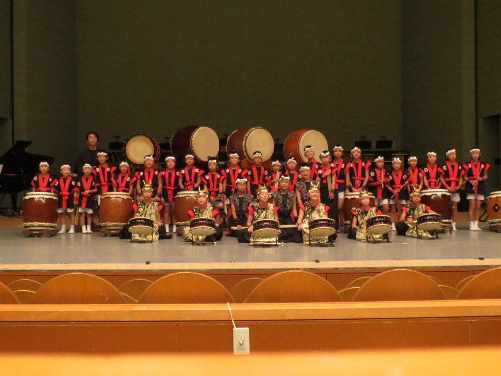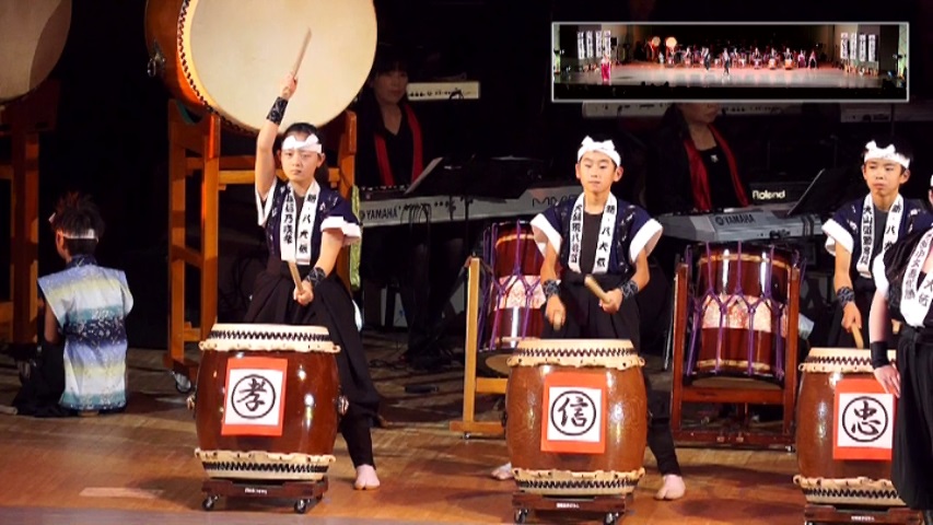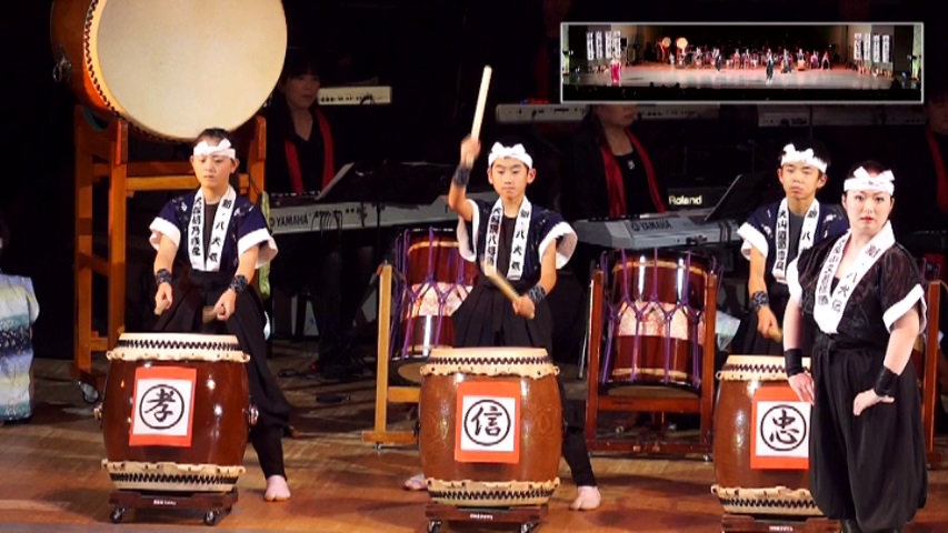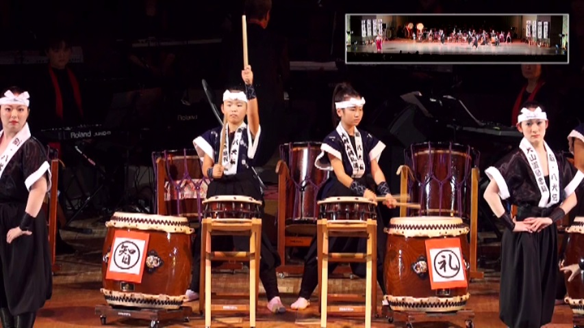 開場10分前(15:20)出演者全員で成功に向けて気持ちを一つにして「えいえい!おー!」 その後、大急ぎで集合写真です。(余裕♪余裕♪)ゲネを2回もさせていただきましたから。 (15:30) 予定通りの開場です。早い人は朝8時に並ばれたそうです。ありがたいことです。 (16:05) 5分押しでの開演になりました。 まずは、打吹童子ばやしによる「鼓魂2013組曲」の演奏です。 締め太鼓6人衆による「鼓魂」の演奏です。 |