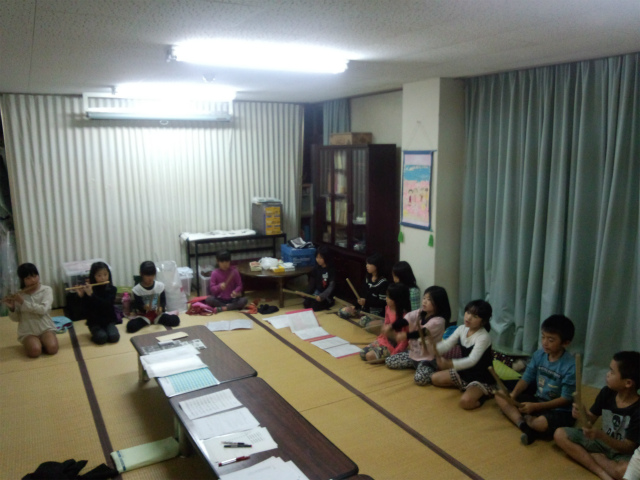 | 2013/11/01 選抜者補習練習会 また仲間が増えました。 一日あけて、選抜者補習練習会を夕方6時から7時半まで、向山保育園の会議室で行いました。 今回、初めて補習練習会に参加した人は、7人です。 3年生のりおさん、あいかさん、なつくん、みずきさん(しの笛) 1年生のりのんさん、そらくん、けんしんくん 全員で、17人が参加しました。 やる気のある人、練習を一生懸命頑張っている人、頑張る姿が育ってきた人の中から選抜で練習会をしました。 最初に、長谷寺の絵馬伝説のドンドコ楽譜を渡して説明をしました。 では、全員でリズム打ちをしてみましょう。 次に、歌の部分を繰り返し練習しました。 練習の途中で、「なんでかな!それは雑音ですよ。」「こうやって練習が止まることが、残念なのです。今は、一生懸命に曲を覚える、演奏方法をマスターするを頑張るときですよ。」「それができる人が今日は呼ばれて来ているのですけど。」 「・・・たった1人の適切でない行動で練習の時間が止まってしまうのです。」 みんなの意識が変化しました。 初めての参加なのに、どんどん上達していきましたよ。 レギュラーの2年生たいかくん、あやかさんも参加してくれました。 遅れて、3年生のみこさんが来ました。桶胴太鼓リーダー5年生のはやてくんも来てくれたので、一緒に練習をしました。 「長谷寺の絵馬伝説」2章・3章を繰り返し練習をしました。 みんなが上達しました。 次の練習日が楽しみですね。実戦でかっこいい演奏を楽しみにしていますよ。 あと、補習練習会に参加していないメンバーは、太鼓グループ6人 しの笛グループ3人です。 次々、補習練習会を計画してみます。 11月11日(月)は、しの笛グループの補習練習会を予定しています。 |