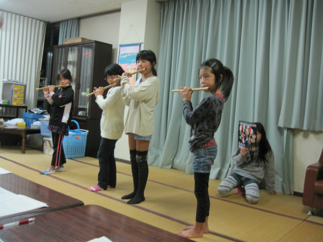 | 2013/11/05 しの笛 新人補習練習会 本当は、6時半から会議がるので、今日は無理かなと思っていましたが、 会議は遅れて参加することにして、昨日に引き続きですが、しの笛の補習を夕方5時半から向山保育園でしました。 案内は、早朝メールで流したので・・・・急ではありましたが、参加者3人の予定でしたが、みずきちゃんが1人参加してくれました。 マン・ツー・マンでの練習でしたので、しっかりとした練習になりました。 長谷寺の絵馬伝説→MATSURI→祭囃子→うたげ 伏姫のテーマ→戦いの章 を繰り返し練習をしました。 とっても良い音が出る瞬間があります。さすがです。一生懸命の練習が上達への近道ですね。