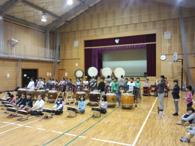 | 2013/11/08 11月10日と17日のための特別練習会 「鳥取県和太鼓連盟コンサート」ゲスト演奏に向けての最終練習会をしました。 子ども達の目は試合モードになってきましたよ。 今日は、11月17日の「倉吉子どもハッケン伝」の宴の踊りの練習に向山保育園の年長組さんも参加してくれました。 5時30分「こんにちは〜!」可愛い元気な子ども達が会場にやってきました。同じく次々と向山保育園の保護者の皆様もやってこられました。 まずは、ミーティング。打吹童子ばやしの子ども達と向山保育園の子ども達と「ワッショイコール合戦」をしました。 とってもいい雰囲気です。 踊りの合同練習は6時からということで、最初に、オーライやぐらのソロ→長谷寺の絵馬伝説2章・3章→MATSURI→祭囃子→うたげ を通して演奏しました。子ども達は、試合モードで演奏しました。 向山保育園の子ども達には、打吹童子ばやし演奏や宴の踊りを1回見てもらいました。 さて、6時です。会場は、向山保育園の子ども達(16人)と保護者と先生、打吹童子ばやしの団員(48人)と保護者、LEGEN童の団員(12人)と保護者でとっても熱気ムンムンです。とっても視線が熱いです。 それでは、宴の練習開始です。向山保育園が1列目、その後ろに打吹童子ばやしが2列に並んで整列です。 打吹童子ばやしは鈴を持って、向山保育園は銀のスティックをもって踊りました。 気持ちのいい踊りでした。 太鼓の教え子3代が勢揃いです。・・・10年という時間が逆戻りするような感慨深いものがありました。 いつかは、LEGEN童の子ども達も一緒に、3団体さらには他団体も一緒に「うたげ」ができたらいいね。 2回 うたげを踊って、うたげの合同練習は終了です。 打吹童子ばやしの「鼓魂2013」の演奏をしました。向山保育園の子ども達・保護者の皆様も帰らずに観てくださいました。 打吹童子ばやしの子ども達の演奏や態度、姿勢にものすごく感動しました。向山保育園の子ども達にとっては憧れの打吹童子ばやしのメンバーがそこにいるのです。可愛い熱い眼差しを感じたので「向山保育園のみなさん♪ 向山夢太鼓を演奏しませんか。」「した〜い!」即の返事が返ってきました。 「打吹童子ばやしのみなさんは、向山保育園の子ども達の演奏を観て、自分たちにはないものを感じてください。後で、リーダー、副リーダーを中心にみんなでミーティングをしてください。」 予定になかったサプライズごとですから、保育園の子ども達はバチを持ってきていません。打吹童子ばやしの子ども達からバチを借りて、ちょっと高さも違う太鼓に向かいました。締め太鼓さんは、立ち台ではなく座式で演奏です。 では、17日の「とりアート 倉吉子どもハッケン伝」での流れでします。 ジャカジャカジャ〜ン♪パイレーツオブカリビアンの演奏が流れています。子ども達は構えています。曲が終わりました。 演奏開始です。 カカン!「むこうやまゆめたいこ! やあ!」 ちょっとばらつきはありますが、子ども達の一生懸命の気持ちがグングン観ている人の心にぶつかってきます。とっても熱い演奏です。拍手・拍手です。 あんなに幼い子ども達が一丸となって向かってくる飾りのない演奏は観る人を感動させますね。 また、今日はあこがれの打吹童子ばやしのみなさんの前での演奏です。良い経験ができましたね。また明日からあと1週間、本番に向けて細かいところの練習を頑張ってね。 保護者の皆様も一生懸命です。またまた今日も泣いている保護者がおられましたよ。 時間は、6時25分 「ごめんねLEGEN童さん。あと10分ください。」 最後に、打吹童子ばやし「鼓魂2013」の仕上げと出演者決定の演奏を全員でしました。 10日の未来中心大ホールにおいて、太鼓での初舞台の子ども達を決定しました。まだまだ、打吹童子ばやし奏者としては未熟です。子ども達には、出演決定が目標ではなく、ここからいかに上を目指せるか、その子の努力と仲間、家族の応援を期待したいと思います。このことがとっても大事なところです。 向山保育園の皆様も誰も帰られることなく、打吹童子ばやしの演奏を観てくださいました。ありがたいことです。 ひょっとすると、打吹童子ばやしは憧れというより目標なのかもしれませんね。