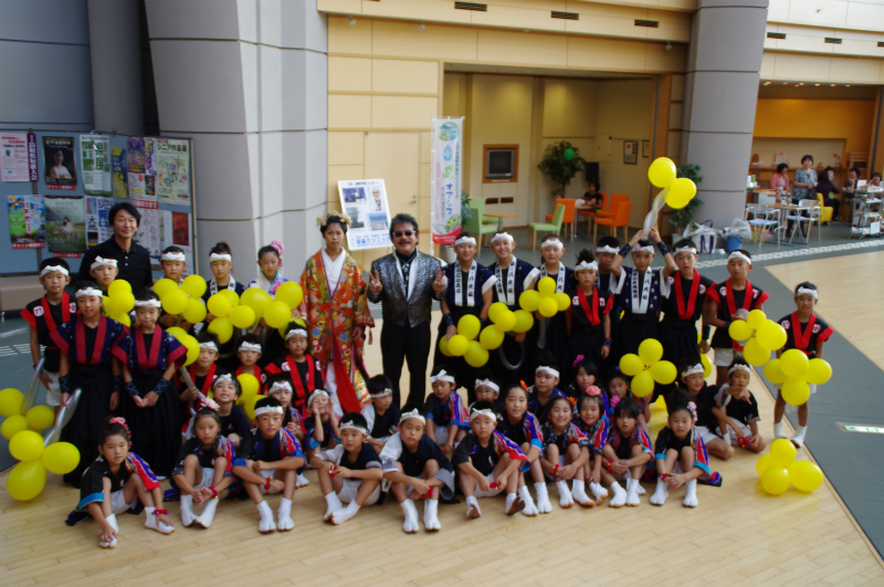 | 2013/10/06 MALTAさんからサプライズ!です。 しばしの休憩の後、いよいよフィナーレに突入です。 菜の花をあしらったバルーンアートを手にステージに向かいます。出演団体すべてがステージに揃ってフィナーレスタートです。 MALTAさんの名曲「HIGH PRESSURE」に合わせて、ステージいっぱいの菜の花がゆれ、会場全体が手拍子に包まれます。 観客席も総立ち状態でボルテージは最高潮です!! 大興奮のフィナーレ終了後に、再びアトリウムに場所を移して観客の皆さんをお見送りです。大きな声で「ありがとうございました!!」 お客様から「よかったよ!!」「感動したよ!!」「こんなに小さい子どもたちが演奏しとったの?演奏しとると大きくみえてたわ」「踊り可愛かったよ〜」などと多くの声をかけていただきました♪ アトリウムでお客様をお見送りしていたら、忙しい中、童子ばやしの子ども達のためにMALTAさんが駆けつけてくださいました。 こんなことってないですよ。うれしいね。ありがとうございます。 MALTAさんのサプライズに保護者も興奮気味です(笑) 多くの童子ばやしメンバーに声をかけていただき、総勢44名の童子ばやしと記念撮影。八犬士&伏姫’sと一緒に記念撮影。 忙しいなか童子ばやしメンバーのために足を運んでいただいたMALTAさんに心より感謝いたします。子ども達にとっても本当に良い思い出ができました♪ 天女音楽祭終了後の懇親会にてMALTAさんより「打吹童子ばやしの演奏は、とっても良かったよ」と声をかけていただきました♪ また、他の出演団体の方やスタッフの方からも「太鼓で盛り上がったね〜」などと絶賛する声をかけていただきました。 MALTAさんを始め、参加された出演団体さん、音響さん、照明さん、舞台スタッフさん、実行委員会のみなさん、たくさんの人がかかわって、素晴らしい舞台にしていただき、その舞台に立たせていただいた事を心より感謝いたします。 「倉吉天女音楽祭」に出演した22期メンバー全員が大きく成長できたと思います。今回経験したことを糧に、レギュラーはさらなる高みを目指し、まだレギュラーになれていない子はレギュラーになれるように日々の練習を頑張っていきましょう!! |