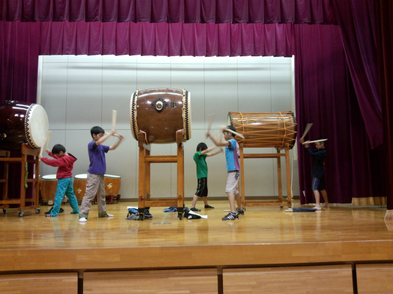 | 2013/10/09 定例練習会 凄く集中した練習ができました。 大舞台を踏んで、みんなの頑張る姿勢がぐぐと変わりましたよ。 まず最初に、「倉吉天女音楽祭では、みんなが頑張りましたね。」 「さて、これから目指すところを確認します。鼓魂2013を11月10日には鳥取県和太鼓連盟の演奏会で演奏します。11月17日はとりアートのオープニングで演奏します。流れを言います。@鼓魂締め太鼓バージョン Aオーライ!やぐらソロ B長谷寺の絵馬伝説2章3章 CMATSURI羽衣しの笛ソロ D祭囃子 やぐらソロ、宮太鼓揃い打ち、桶胴太鼓揃い打ち、宮太鼓揃い打ち、全員揃い打ち の流れで演奏します。それぞれの曲の選抜試合の候補生を発表します。重複しますが、頑張ってください。」 「宴の踊りは、大太鼓を打つようにドン♪斜めの太鼓を打つようにドン♪・・・・・・。」踊りのポイントを確認しました。 早速、宴の演奏と踊りをしました。みんな切れ味抜群の踊りを見せてくれました。素晴らしい。 長谷寺の絵馬伝説2章を練習しました。 グループに分かれて、6年生が指導に入りました。 桶胴グループは、打てるレギュラーが手本になって練習しました。 最後には全員で2章、3章を通して打ってみました。 なんとなく選抜メンバーはついてきています。がんばれ〜。 最後に、「鼓魂」締め太鼓バージョンを演奏してみました。 鼓魂の選抜候補生以外は、AパートとBパートに分かれて演奏を聴きました。 終わりのミーティングで、頑張る目標を確認しました。 「先生は、しばらく薄情者になります。やる気のない人はおいていきます。間違えても一生懸命に覚えよう、上手になりたいという人とどんどん先へ練習を進めていきます。レギュラーといえども、6年生といえども頑張れない人は、関係なく選抜試合から落としていきます。頑張ったメンバーでステージに上がりたいと思います。いいですね。みんな、がんばってくださいね。今日練習したことは、必ずお家で復習、練習をしてくださいね。」 お家からも頑張っている人に、音無しくんマットを貸し出しました。
