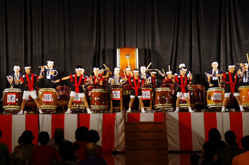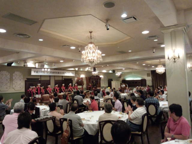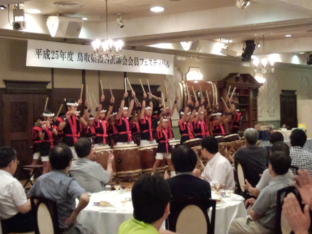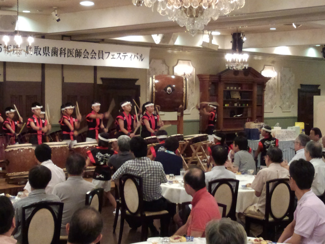 | 2013/08/24 鳥取県歯科医師会「会員フェスティバル」で、元気のいい演奏をしました。 元気のいい演奏でしたね。 8月24日夕方6時30分より、ホテルセントパレス倉吉にて 鳥取県歯科医師会「会員フェスティバル」がありました。東部、西部からも歯医者さんが参集です。 打吹童子ばやしは、開会セレモニーを終えて、懇親会の前に地域の芸能として演奏を披露しました。 MATSURI羽衣→うたげ を演奏しました。 元気のいい声、勢いのある演奏でお客様を圧倒しました。 今日のために、2尺4寸(浅野太鼓)の大太鼓を持っていきました。やぐらソロはとってもいい響きをしていましたね。 10分の演奏時間なので少々インパクト的には物足りない気がしますが、子ども達は一生懸命演奏しました。 演奏後には大きな拍手をいただきました。「すごいねえ。すごいねえ。」お客様から子ども達はいっぱい声をかけられていました。 出演機会を与えてくださった中部歯科医師会並びに鳥取県歯科医師会の皆様ありがとうございました。 また自信になりましたね。もっともっと練習して、たくさんの方にもっとすごいところを見せてあげましょうね。 来週は、9月1日に「倉吉せきがね里見まつり」です。22期メンバーでの初披露です。 |