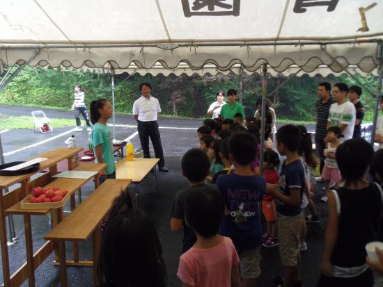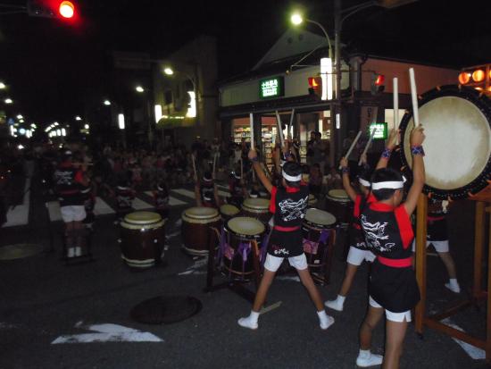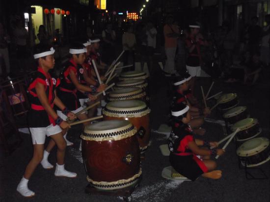 | 2013/07/27 打吹天女伝説まつりで粋のいい演奏をしました 打吹天女伝説まつり 午後7時30分から銀座商店街 明治町交差点で演奏しました。 米田けんしんくん(4年生)と山根ななさん(4年生)が合流です。 午後6時から歩行者天国になって、成徳小学校と明倫小学校合同チームの金管バンドが東西南北にパレードです。 団員のななちゃん(4年生)の頑張っている姿を応援しました。 続いては、成徳小学校全生徒による「みつぼし踊り」です。 ゆったりと祭りが進行していきます。白壁土蔵並みでは「光の回廊」が同時開催されていました。 「7時40分より打吹童子ばやしのみなさんによる和太鼓の演奏があります。どうぞお集まりください。」 会場アナウンスが銀座通りのスピーカーから流れると、たくさんの打吹童子ばやしファンのみなさんが集まってこられました。 明治町交差点に太鼓を移動して、お客様の前でセッティングをして、曲のフォーメーションを確認して、早速演奏開始です。 地声で「みなさんこんばんは。打吹童子ばやしです。打吹童子ばやしは、打吹山に伝わる天女と童子の伝説を子ども達、童子の奏でる笛太鼓で伝承していこうと1992年に誕生した子ども太鼓連です。 打吹天女伝説まつりは、打吹童子ばやし誕生の翌年1993年に第1回目が始まりました。以来、打吹童子ばやしはレギュラーとして出演させていただいています。 打吹童子ばやしは今年で22年目の活動になります。 今日デビューする子もたくさんいます。 今日は、MATSURI、打吹童子ばやし「天女と童子の物語、うたげを演奏します。どうぞ聞いてください。」 だんだんだだん♪「わっしょいわっしょい♪」 らいやくんのやぐら太鼓の音が勇ましく響きます。気合十分です。 掛け声もとっても元気です。 1曲目のMATSURIの演奏も最後はばっちり決まりました。 「みなさんこんばんは。打吹童子ばやしです。次に演奏しますのは、打吹童子ばやし 天女と童子の物語です。」 リーダー代行の門脇ゆいさんの清々しい声がお客様に届きました。 2曲目の打吹童子ばやしプロローグでは、 気合が入りすぎて、新レギュラーくん達は、猛スピードなテンポで打ちまいた。経験十分のレギュラーはそこは冷静に演奏しました。(今後の練習目標ができました。) 3章での、宮太鼓グループの演奏は圧巻です。 気持ちが前のめりで、とっても威勢よくかっこ良かったです。 今日は、【達人】門脇ゆいさん(6年生)1人と4年生男子3人と4年生女子1人 5人で揃い打ちをしました。 みんながノリノリの演奏をしました。 私も祭りのりで一生懸命掛け声を出しました。「いいぞ〜!」 「それそれそれそれ〜♪」 ストリートライブならではのノリです。 子ども達もお客様も楽しそうです。 全員揃い打ちでは、ますますノリノリの演奏です。 「わたしは、この子らの演奏が大好きだに。いつも応援してますよ。今日も元気をもらったよ。ありがとう。」 お客様から演奏中に、涙ぐんで声をかけられました。 ありがたいことです。 3曲目は、新・八犬伝より「うたげ」です。 打吹童子ばやしが終わると間髪入れずに、山根みゆさんのしの笛が入りました。 やあ〜♪ライブですねえ。 踊りは、りょうくん、けんしんくん、たいかくん、なみこちゃん、あやかちゃん、みずきちゃん です。 あらら、うたげの演奏者が少なくなっちゃいました。 ・・・演奏できるメンバーが少ないことに気づきました。・・・今後の練習課題ですね。 和やかな雰囲気で自然に手拍子が湧いて、最後もばっちり決まりましたね。 時間があるので、ライブ感覚で団員紹介をしました。 最年少2年生組から順に一人ずつ紹介しました。なかなかないですが、これからもあってもいいのかな。 交差点で演奏なんてなかなかできない経験をしましたね。 来週の祭りのストリートライブのリハーサルに十分なりました。 「打吹天女伝説まつり」出演者 (締め太鼓) 谷口まお(6年生) 山根なな(4年生) 秋月みこ(3年生) 磯江あやか(2年生) (宮太鼓) 門脇ゆい(6年生) 米田けんしん(4年生) 山根りょう(4年生) 石坂りく(4年生) 山根なな(4年生) (桶胴太鼓) 秋月はやて(5年生) 坂井たかほ(5年生) 大番たいか(2年生) 福田みずき(2年生) (やぐら) 林らいや(6年生) 古林くうた(5年生) (篠笛) 山根みゆ(6年生) MATSURI(5分)→打吹童子ばやし(12分)→うたげ(3分) みんなで集合写真を撮った後、控室でミーティングです。 まずは、副リーダーから今日の演奏の講評です。 つづいて、6年生のまおさん、みゆさん、らいやくんが講評しました。 「練習をもっと真剣にやろう。」みんなの共通したコメントです。 いつも本番に向けての意識を持って練習すること、いい加減に感覚で練習しているから、いざ本番で勝手な演奏をしてしまうのです。 まだまだ、100点の演奏ができないのだから、まずは100点の演奏ができるレギュラーになってください。 その次は120点レギュラーですよ。 今日の演奏は75点です。でもみんなの気合は120点です。すごい!(拍手♪) 気持ちの入った、
