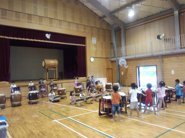 | 2013/08/07 定例練習会 決まり良く、気持ちの入った練習ができました。 打吹まつりお疲れ様でした。と〜ても楽しかったね。 今日は、とっても蒸し暑かったですね。風の通るところに太鼓をセットして練習をしました。 今日からは、全員が打吹童子ばやしの並びで練習です。 まずは、「童子01」をレギュラーも一緒に演奏をしました。・・・かっこいい!☆☆! 合宿でレギュラーになったメンバーにレギュラーの印しを渡しました。「レギュラノーの印しは重たいよ。しっかり練習しようね。」 見学者があったので、もう一度「童子01」を全員で演奏しました。 次に、全員で打吹童子ばやしのプロローグ→1章を練習しました。 1章の終わりを解説しながら練習です。・・・すごいなあ!01の子ども達もついてこれるようになっていました。ピタッと決まりました。 1章の締め太鼓のソロから終わりまでを通してみました。いい感じで決まりましたよ。 基本打ちをしました。しっかりと腕を振り上げて打ち込む!早いリズムもしっかりと腕を振る! 続いて2章です。どんどんどんどん♪どんどこどこどん♪どこどん♪どこどん♪どんどこどこどん♪ 続けて3章も演奏しました。 今日の練習は、これで終了です。 最後に、ミーティングです。 11日は、レギュラーとレギュラー候補生の練習会です。14日の定例練習会はお盆でお休みです。17日は、馬場町の夏祭りでレギュラーが出演します。 ワッショイワッショイ!6年生5人と先生の音頭でワッショイコールです。いい声が響いています。 リーダー「これで太鼓の練習を終わります。ありがとうございました。」「ありがとうございました。」 今日から新団員が1名増えました。灘手小学校3年生のナツくんが入団です。 |