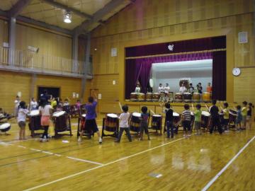 | 2013/05/29 定例練習j会 今日は、新団員のための新曲のリズムを繰り返し練習しました。 どんどこ どんどこ どこんこ どこんこ♪ 全員フロアに輪になって、繰り返し打ちました。表現を大きくなかなかできないね。 全身で打つ。体を小さく前傾で打ち込む。目線は下から・・・。 汗だくです。休憩は、自分のペースでとりながら、締め太鼓、宮太鼓、桶胴太鼓を移動しては打ちました。 段々良い音になってきました。 みんなの手本になるような、パフォーマンスと打ちができるようになったメンバーは、円の中心で打ちました。 最後に、MATSURIを全員で演奏しました。 総集編で、新曲のリズムをセンターで演奏したメンバーで、新団員、保護者の皆さんに聞いていただきました。 なかなか力強い曲でしょ! ワッショイコールを1〜5年生対6年生でやって、練習を終了しました。 これから暑くなります。熱中症対策をしましょう。 6月、7月の予定表を配りました。 6月1日(土)の午後から特別練習をします。