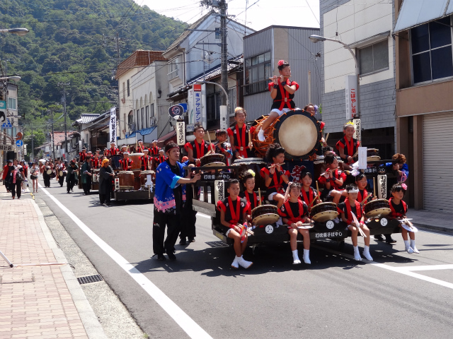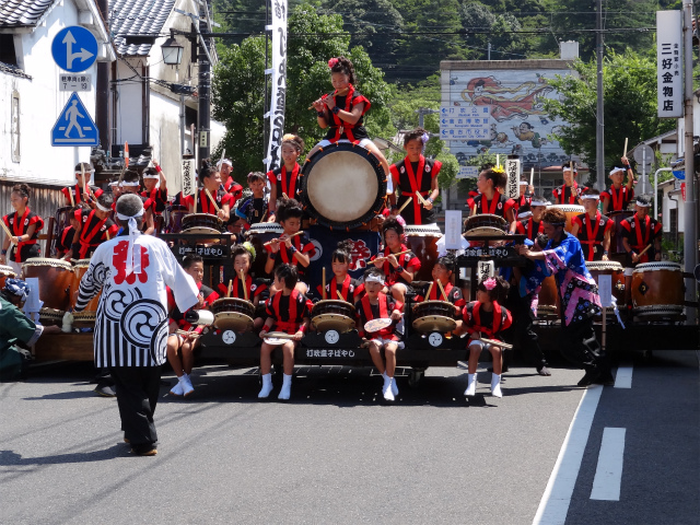 | 2012/07/28 倉吉天女伝説祭りで心を込めて演奏しました。 夕方7時30分より、倉吉銀座商店会の倉吉天女伝説祭りで心を込めて演奏しました。 午後6時 控室でミーティング中 ふと見ると、外はどしゃ降りです。雷も鳴り始めました。 今日は、演奏は無理かも・・・と思わせるくらいの降り方です。 しかし、そこは打吹童子ばやし。 出演時間の7時30分には見事に雨も止んで、演奏が終わるころには、月が出ていました。 今日は、21期のデビュー戦です。 最初に、鼓魂を演奏しました。 1番太鼓は、中山しゅんすけ君と林らいや君です。 打吹太鼓の皆さんの前でかっこいい演奏をしました。 2曲目は、「うたげ」をしました。夢太鼓組が踊りを踊りました。 手拍子をいただいて楽しく演奏ができました。。 続いて3曲目は、打吹童子ばやし3年未満のメンバーによる「夢太鼓」を演奏しました。 演奏は少々荒いけど、お客様から「勢いのある演奏でした。」「元気をもらった。」と感想をいただきました。 坂井たかほ君、山根りょう君、石坂りく君、林としや君がやぐらデビューをしました。 坂井君のやぐらは一生懸命が伝わってかっこ良かったですよ。 みんなが、デビュー戦を頑張りましたね。 演奏が終わって、控室でミーティング。子ども達の姿に少々成長を見ました。これからが楽しみです。 坂井副リーダーから今日の頑張れたことを含めて総括を発表してもらいました。 「今日はとても暑い日でしたが、みんなが気持ちを一つにして頑張れたと思います。演奏する曲をしっかりと覚えて、たくさんの人に元気を与えるような演奏を目指して頑張っていきましょう。」 終わりのあいさつリーダーは、中山君でした。 お互いに頑張れたことを称えあって、また今日支えてくださったお家の方々に感謝をして 「今日の打吹童子ばやしはこれで終わります。」「ありがとうございました。」 打吹童子ばやしの夏がいよいよスタートしました。 団員には、自分のことは自分でできるようになろうと目標を持っていますが、知らない所、段取のわからないところでの演奏をしますので、保護者の皆様も声を掛け合って子ども達をサポートしていきましょう。 周りが見えない子ども達もいろんな出会いや体験、経験を積んで成長していきます。 子ども達でできること、手助けしてあげないとできないことがあります。 これからも温かい目でご支援をよろしくお願いします。 明日は、「高城まつり」です。高城地区で初めて演奏します。 |