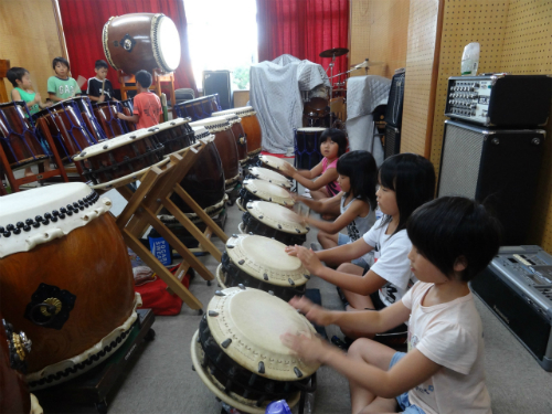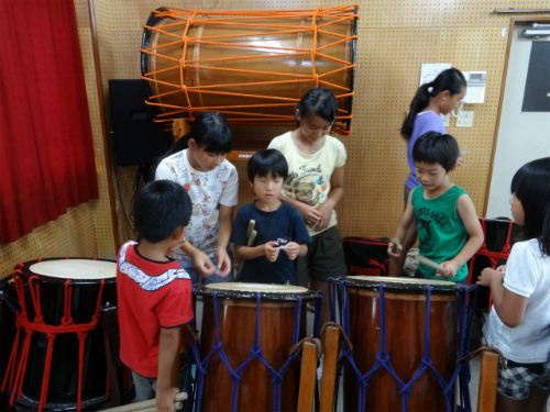 | 2012/07/04 定例練習会 団員がそろうまで、長谷寺のリズムで基本打ちをいました。 15分位やぐらのソロを打たせてもらいました。気持ちいい汗をかきました。 開会セレモニーをして、練習に入りました。 今日は、打吹童子ばやしのプロローグを「鼓魂」に変えて練習しました。 今年の夏は、打吹童子ばやし新バージョンで行きます。 新人さんには締め太鼓のソロがわからないので、ソロ部分を含めて、リズム遊びを15分くらいしました。 腕を伸ばしたり、体を曲げたり、飛び上がったり、休んだり、3連符や裏拍あり、いろんなリズムを真似してもらいました。 凄いです!!みんなついてきます。・・・本当 感心するくらい良くできました。 いよいよ、鼓魂と打吹童子ばやしの合体です。なかなかこれもいいですね。 ・・・打吹童子ばやしのプロローグはしばらくしないので忘れちゃわないでね。 5分休憩の後に、向山夢太鼓を有志で打ってみました。良い演奏ですが・・・声がなかなか出ませんねえ。プライドが邪魔しますかねえ。(笑い) 最後に、長谷寺の絵馬伝説→鼓魂・打吹童子ばやし2章までやって、続けて3章はMATSURIショートに変更して演奏しました。 みんなの気持ちが一つになってきました。頑張ったね。 吉良くんと林らいやくんの鼓魂のやぐらの掛け合いは、本当にかっこいいですね。ますます道に入ってきましたよ。 末兼くんより今日の頑張った人を発表してもらいました。「田中将太くんが一生懸命打っていたので良かったと思います。」(拍手) 副リーダーより「強弱も意識して演奏できたし、みんなが集中して練習していたので良かったと思います。」 リーダーより「リズムも意識して演奏できたし、声も出でいて良かったです。」 わっしょいコールをしてから終わりのあいさつです。 あいさつリーダーは、末兼ひろとくんでした。 中部水泳大会の練習で疲れているでしょが、リーダーも副リーダーも頑張りました。