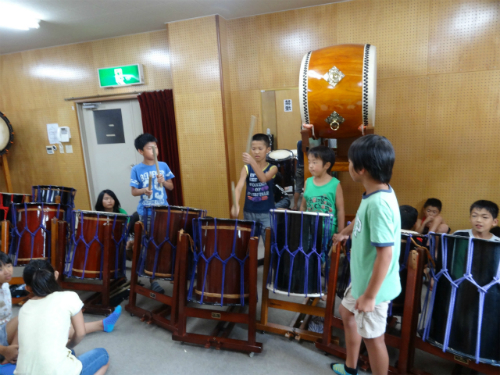 | 2012/07/18 定例練習会 基本打ち、リズム遊びをたくさんしました。 途中リズム遊びの中で、向山夢太鼓のリズムを打ってみました。気持ちがのって来ましたよ。 打吹で山車巡行で演奏する「日本のまつり」を短縮バージョンでやってみました。凄いです♪全員がぴたりと終りました。 6時 あらためて 練習開始のセレモニーをしました。 まずは、リーダーから今日の目標です。「気持ちを集中して、声を出していきましょう。」 副リーダー「強弱に気を付けること。テンポが速くならないように気を付けましょう。」 ワッショイコールをして練習開始です。 鼓魂(一番太鼓は、Aパートが吉良くん、Bパートが中山くん。)→打吹童子ばやし1章、2章 新・八犬伝の戦いの章、宴の章 MATSURI(ショート) 終わりのあいさつ リーダーから今日頑張ったこと「みんなが集中して練習ができたし、声も出ていて良かったです。」 副リーダーから「強弱を意識して演奏できていました。テンポは少し早くなってしまうところもあったけど、みんなが気を付けて演奏できていました。」 頑張っていた人を発表です。田中しょうた君から「末兼くんです。声をしっかり出して演奏していました。」(拍手) ワッショイコール♪をして練習を終わりました。 いよいよ、夏休みです。そして、21日、22日は合宿です。 休憩時間には、お互いを高め合う姿を期待していますよ。