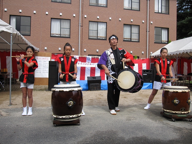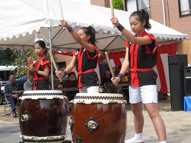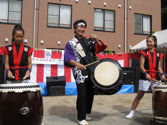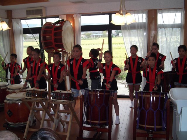 | 2011/10/01 打吹四人ばやしで敬老会にて演奏 関金インターケアハウス・関金みのりグループホーム合同敬老「収穫祭」に 打吹四人ばやしで「長谷寺の絵馬伝説」「MATSURI」を演奏しました。 篠笛にみゆちゃん(小4年生)、宮太鼓にあきらちゃん(小6年生)とかんなちゃん(小5年生)に協力していただきました。ありがとう。 わっしょいわっしょい♪と大盛り上がりでしたね。 エンディンッグはばっちり決まりましたね。終わり良ければ・・・良し良し♪ |
