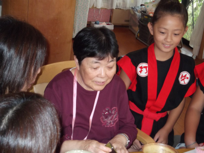 | 2011/09/18 グループホームで打吹童子ばやし 福守町のインターグループホームで午後3時から敬老祝賀会に参加しました。有志11人がおじいさんおばあさんの前で「MATSURI」と「うたげ」を演奏しました。アンコールにもう一度MATSURIを演奏しました。 とても喜んでください。アンコールではワッショイ♪の掛け声と手拍子で盛り上がりましたね。 演奏後は、2階と1階に別れて一緒にお抹茶をいただきました。 参加してくれたメンバーに感謝します。 |