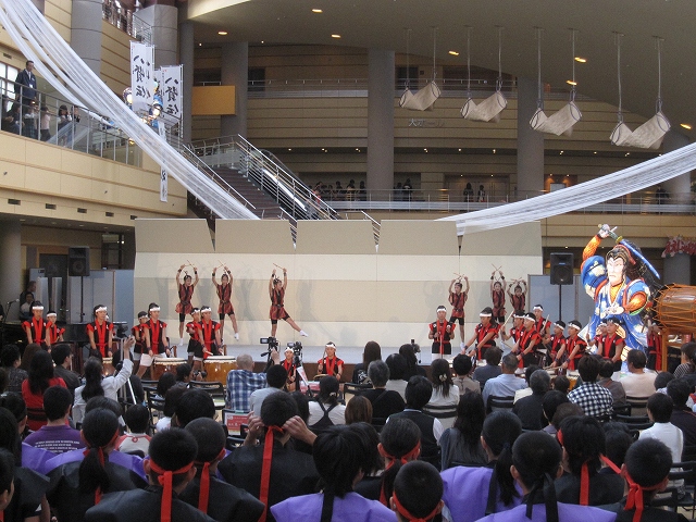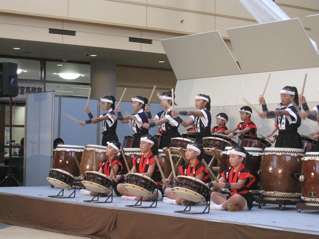 | 2011/10/15 .とりアート 「中部地区子ども芸能まつり」を盛り上げました。 鳥取県総合芸術文化祭 とりアート 「中部子ども芸能まつり」で演奏しました。 オープニングでは、「疾風」で開演を宣言。続いてオープニング演奏「MATSURI」でリトルバレリーナの皆さんとのコラボレーションをしました。 中部地区の伝統芸能や郷土芸能をがんばっている子ども達だけでなく、バレーや踊りなど、子ども達の芸能の発表会を企画しました。 @泊まり貝がら節保存会 A白鳳子ども太鼓 B三朝さいとりさし C社ソーラン(社小学校6年生) D向山夢太鼓(向山保育園年長組) E打吹童子ばやし 社小学校6年生の皆さんの「社ソーラン」は、6年生全員で参加してくださいました。気合十分に元気のいいソーランでした。 向山保育園の「向山夢太鼓」は、今年もすばらしい演奏に拍手が何度も起こりました。アンコールに応えて、もう一度演奏しました。アンコール演奏では、またすばらしい演奏に拍手が何度も起こりました。 本当にすばらしい演奏と保育園の子ども達の純粋パワーに圧倒されましたね。 いよいよ、打吹童子ばやしの出番です。 「MATSURI」と新・八犬伝より「宴の章」を演奏しました。 打吹童子ばやしの演奏には、たくさんの人から「このチームはどこの子ども達ですか。うまいねえ。」と賞賛の声をいただきました。 打吹童子ばやしの強みは、篠笛のメロディーがあるところだなあ思います。 さあ、国文祭に向けて、「演奏のノリと魅せる」をテーマに、集中力を高めて練習していきましょう。 演奏では、声を出すところをきちんと出せるように練習しましょう。 宴の踊りは、練習不足です。きちんと決めるところ、そろえるところを丁寧に練習しましょう。 |