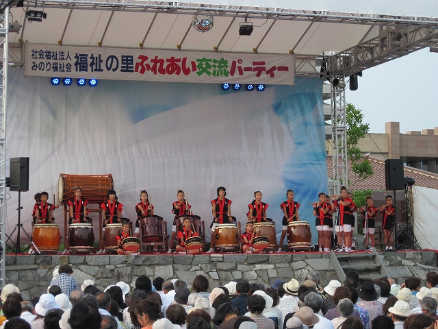 | 2010/07/10 福祉の里ふれあい交流パーティーで 2部の最後を飾って、大勢のお客様の前で演奏しました。 細川たかしさんの歌謡ショーの前とあって客席は超満員。打吹童子ばやしレギュラーメンバー22人が打吹童子ばやし「天女と童子の物語」をかっこよく演奏しました。3章祭囃子では手拍子をいただきました。うれしかったね。 夕方5時15分 打吹童子ばやしのMATSURIの演奏で開演しました。25人のメンバーが演奏しました。素晴らしいステージとたくさんのお客様の前で演奏ができました。ありがたかったですね。 演奏終了後 竹内克文さんと小谷貴代子さんと一緒に記念撮影しました。 |