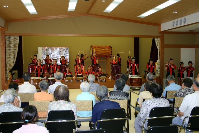 | 2010/07/31 とっとり伝統芸能まつりキャラバン隊 とっとり伝統芸能まつりキャラバン隊として、琴浦町(浦安)社会福祉協議会で演奏しました。 デイサービス利用のおじいさんおばあさんのために心を込めて演奏しました。 MATSURI→打吹童子ばやし→新・八犬伝より宴 を演奏しました。 子ども達が入場すると「かわいいなあ。かわいいなあ。」と声援がありました。 終始手拍子を頂きました。宴では踊り子4人の登場に「かわいいなあ。」と声援がありました。涙流しながら手拍子を頂きました。 とっとり伝統芸能まつりのチラシを子ども達から手渡ししました。 最後に全員が会場の方々と握手をして交流を深めました。 「たいしたもんだなあ。」「ありがとう。」涙を流してほめてくださいました。 |
