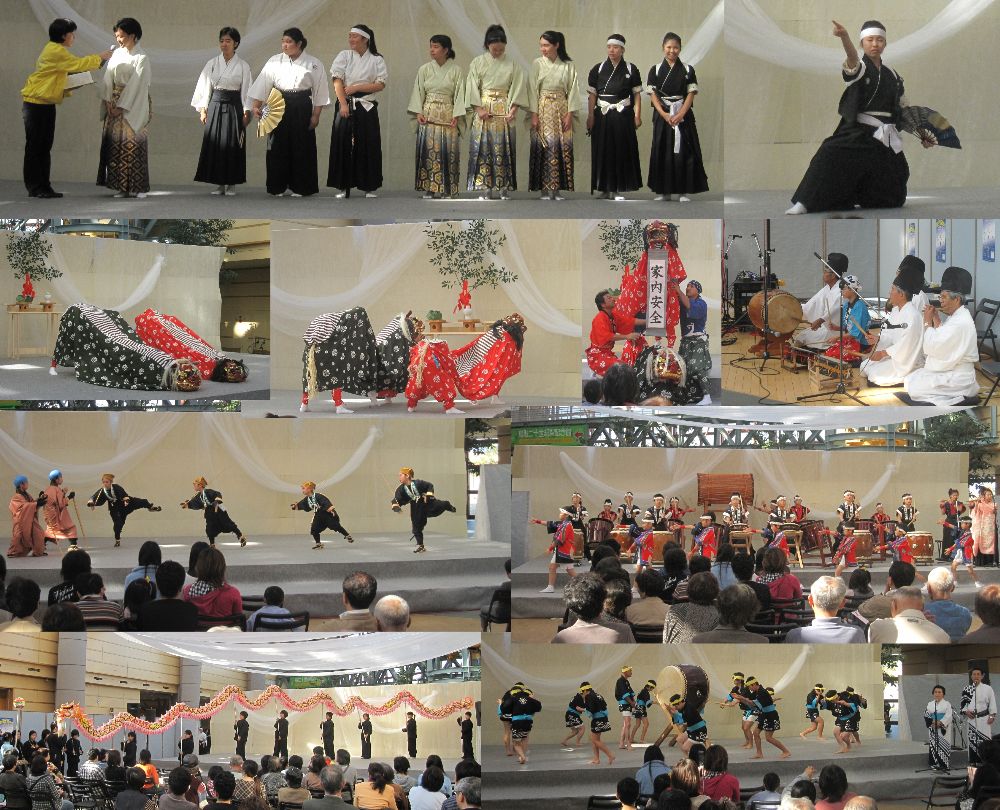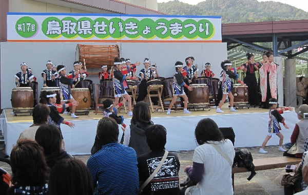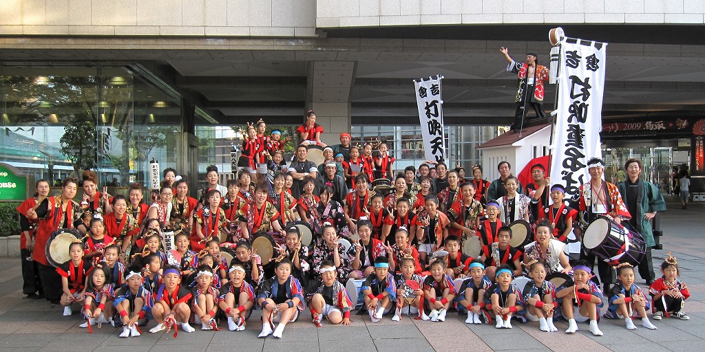 | 2009/11/08 鳥取県総合芸術文化祭 鳥取県総合芸術文化祭中部地区事業が倉吉未来中心アトリウムで11月7日(土)、8日(日)の2日にわたって開催されました。 11月8日(日)10時開演で中部地区の「青少年伝統芸能のつどい」を開催しました。 中部の伝統芸能活動に頑張っている青少年が集まって練習の成果を発表しました。 @<湯梨浜町>東郷小学校飛龍隊(龍踊り) A<倉吉市>倉吉総合産業高校吟詠剣詩舞部(吟詠剣詩舞) B<湯梨浜町>泊貝がら節保存会(泊貝殻節) C<三朝町>三朝南小学校(さいとりさし) D<北栄町>瀬戸獅子舞保存会(伯耆神楽瀬戸獅子舞) E<倉吉市>打吹童子ばやし(新・八犬伝) 打吹童子ばやしは里見伝説「新・八犬伝」を演奏しました。 日本のまつりのステージを見たという方が追っかけで来場くださいました。 みなさんが、「また上手になったんじゃない。」 口々に誉めてくださいました。 中には、初めて見たという方もおられました。 太鼓を演奏した子ども達は、小学2年生から5年生のメンバーです。 応援に駆けつけてくださった皆さんありがとうございました。子ども達にとって励みになります。 次は、来年3月13日(土) 倉吉未来中心小ホールで開催する「子ども太鼓のつどい」に向けて頑張ります。 10月末から、いろんな小学校でインフルエンザが流行っていて、練習日になかなか全員集合ができなかったけど、子ども達は頑張りました。 次の練習日からは、お家芸の「打吹童子ばやし 天女と童子の物語 」を練習していきます。 新人さん達は、日本のまつりであまり太鼓の練習ができていないので、次回からは、3月に向けて気合を入れて頑張りましょう。 |