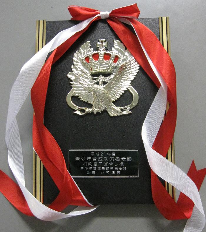 | 2009/10/18 青少年育成県民会議で表彰されました。 10月18日(日) 打吹童子ばやしのこれまでの活動が評価され、青少年育成県民会議で表彰されました。 倉吉市から推薦され、県表彰を受けました。 |