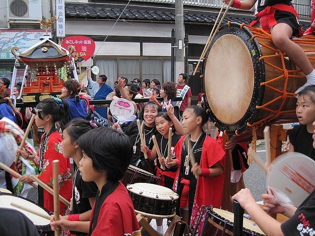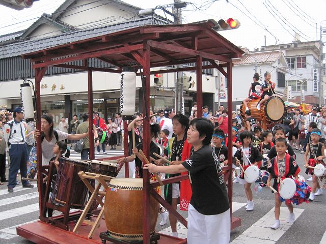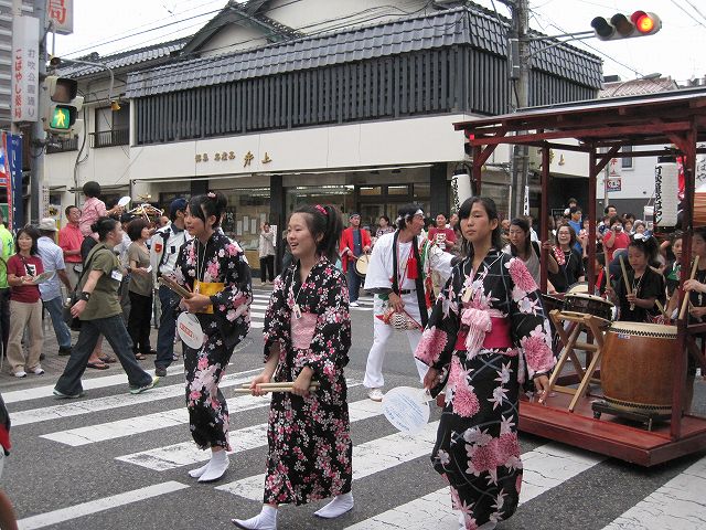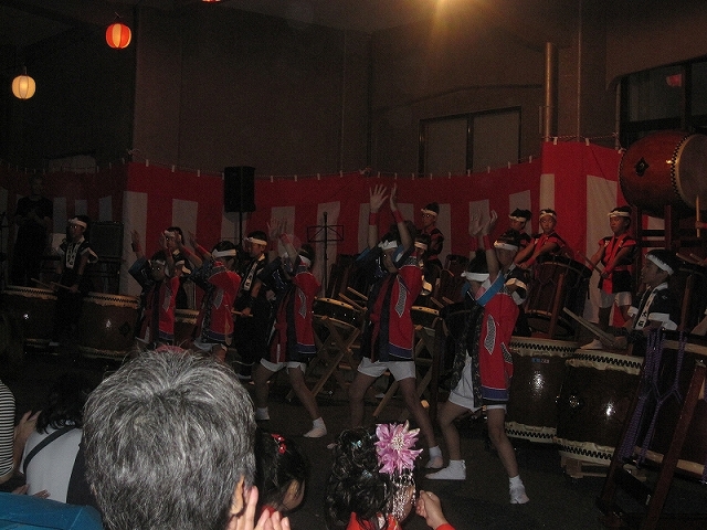 | 2009/08/08 馬場町夏祭りで有志が演奏しました。 馬場町在住の打吹童子ばやしメンバー10人に友達有志6人が加わって、「長谷寺の絵馬伝説」「宴〜新・八犬伝より」を演奏しました。 |