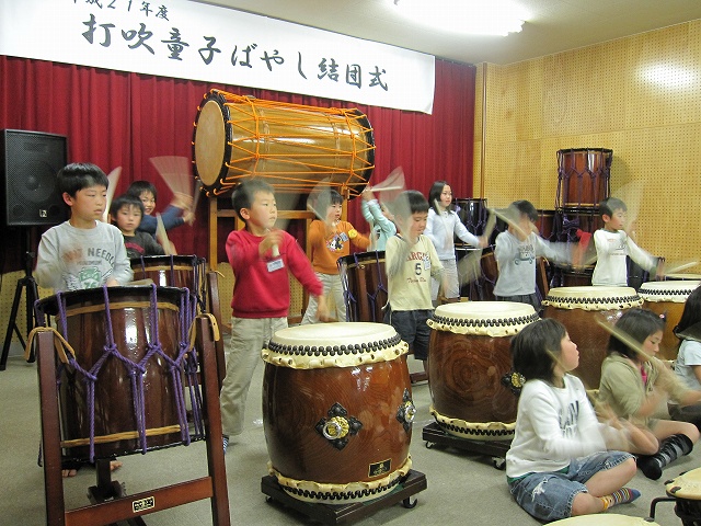 | 2009/06/06 特別練習会 6月6日(土)午後2時〜6時 打吹童子ばやし特別練習会をしました。 がんがん練習しました。手にまめのできた子もいました。 みんなが気持ちを入れて頑張りました。 しの笛の谷本さん(小5年)と締め太鼓の坂井さん(小3年)がレギュラー入りしました。 レギュラーの証 紫帯の桶キーを贈呈しました。 明日も午後2時から6時 特別練習会です。 明日の練習でレギュラー入りできそうな人が何人かいます。頑張ってね。