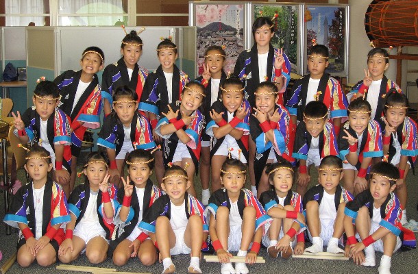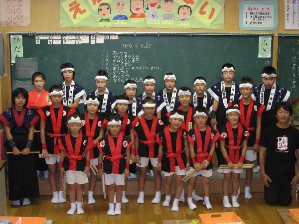 | 2008/09/15 湯梨浜町田後公民館敬老会で心を込めて演奏しました。 9月15日(敬老の日)正午より 「新・八犬伝」を国文祭メンバーで演奏しました。 (実際には、中学生組が3人欠でしたが 義と礼はミニ八犬士が代役でがんばりました。) 昨日は、長谷寺組が頑張ったので、今日は特別気持ちが入った演奏でした。 おじいちゃんおばあちゃんのお祝いの席で心を込めて演奏しました。 「新・八犬伝〜宴の章」では、特別に子ども達の踊りも入って、会場が和みました。 涙して拍手をいただきました。おばあちゃんから御祝儀もいただきました。 アンコールは「打吹童子ばやし〜天女と童子の物語」より3章「祭ばやし」を演奏しました。 とっても喜んでいただいたので、おまけで打吹童子ばやし「プロローグ・1章」も演奏しました。 心からおじいちゃんおばあちゃんの長寿をお祝いしました。 最後まであたたかい声援と拍手をいただきました。 2ヶ月後には国文祭です。県代表ということを自覚して、さらに向上心をもってレベルアップしようね。 本日演奏機会をくださった田後公民館のみなさんありがとうございました。